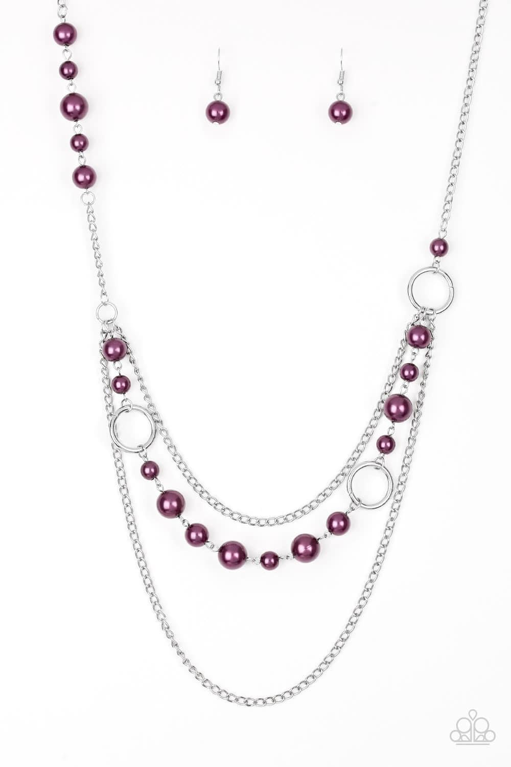 Pearly purple beads and shimmery silver hoops trickle along glistening silver chains, creating mismatched layers down the chest. Features an adjustable clasp closure.