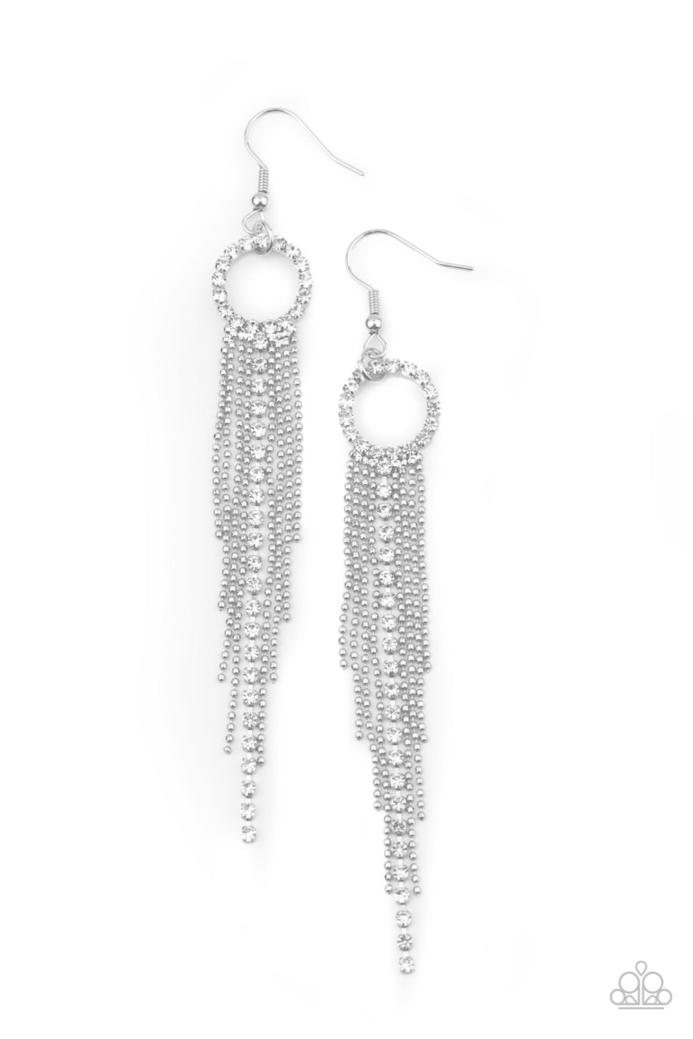 Infused with a sparkly strand of glassy white rhinestones, tapered strands of dainty silver ball chain stream from the bottom of a white rhinestone encrusted ring for a glamorously glittery look. Earring attaches to a standard fishhook fitting.