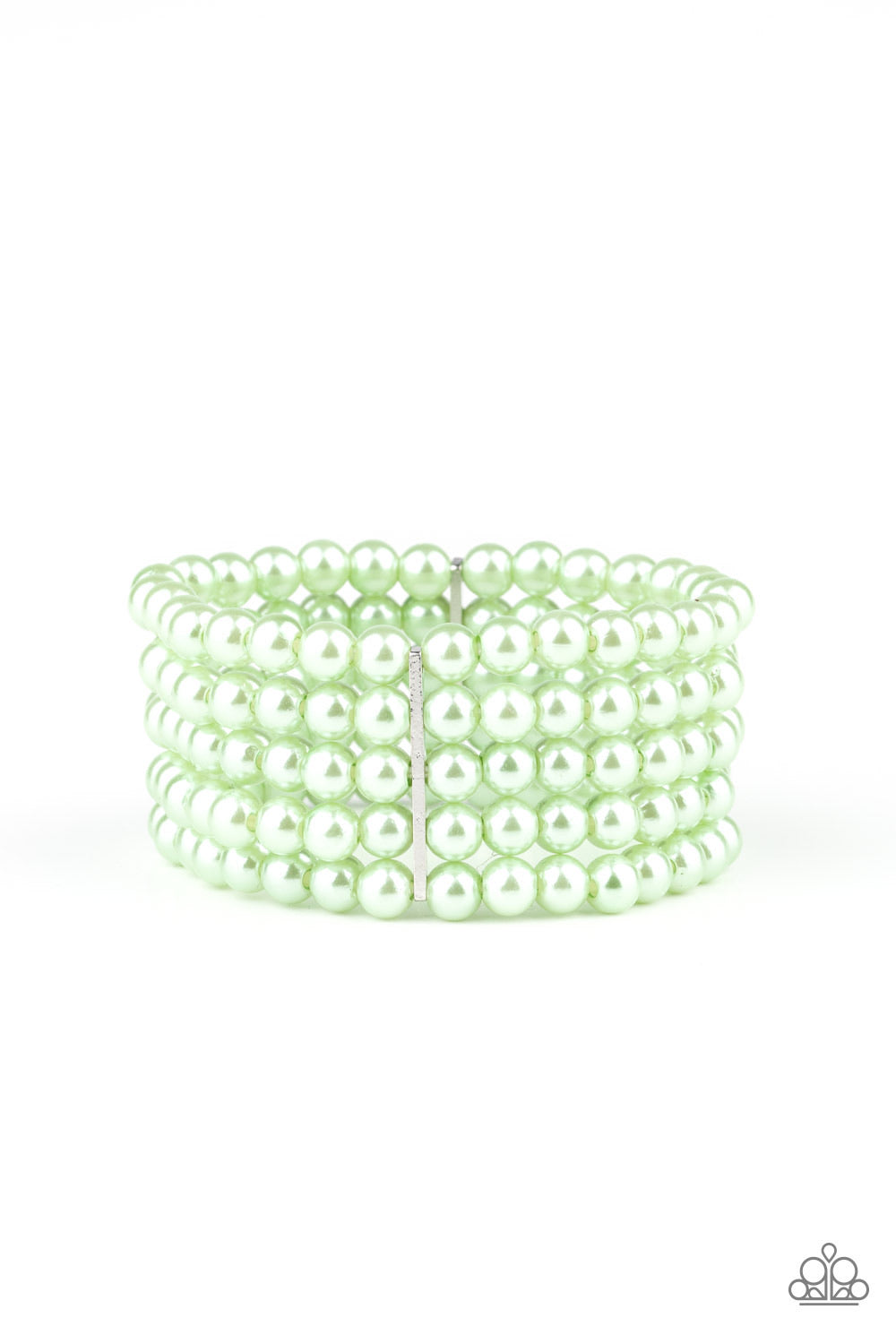 Threaded through glistening silver fittings, strand after strand of dainty green pearls are threaded along stretchy bands around the wrist for a timelessly stacked look.