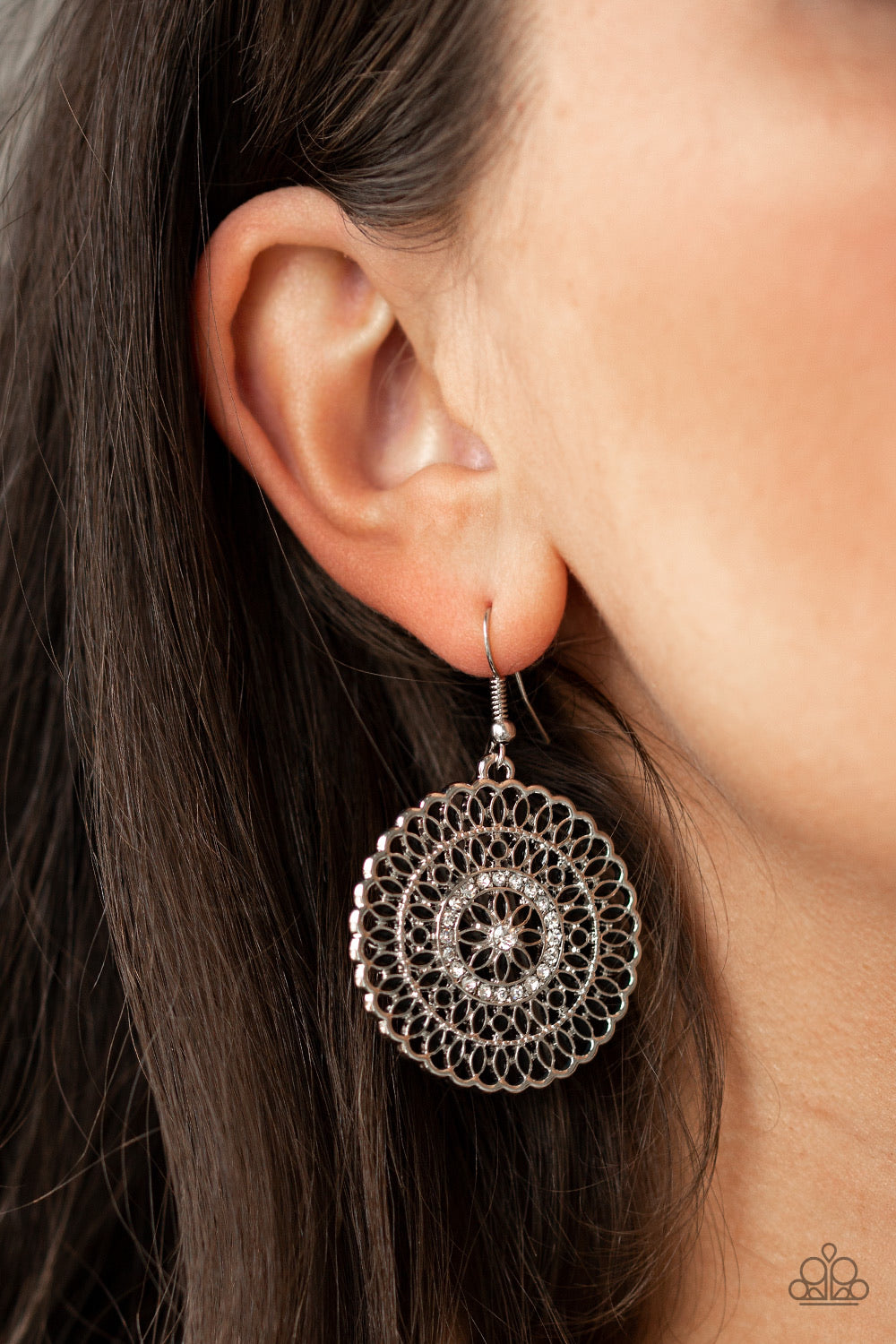 Infused with a ring of dainty white rhinestones, shiny black petals spin around a frilly silver frame for a whimsical look. Earring attaches to a standard fishhook fitting.