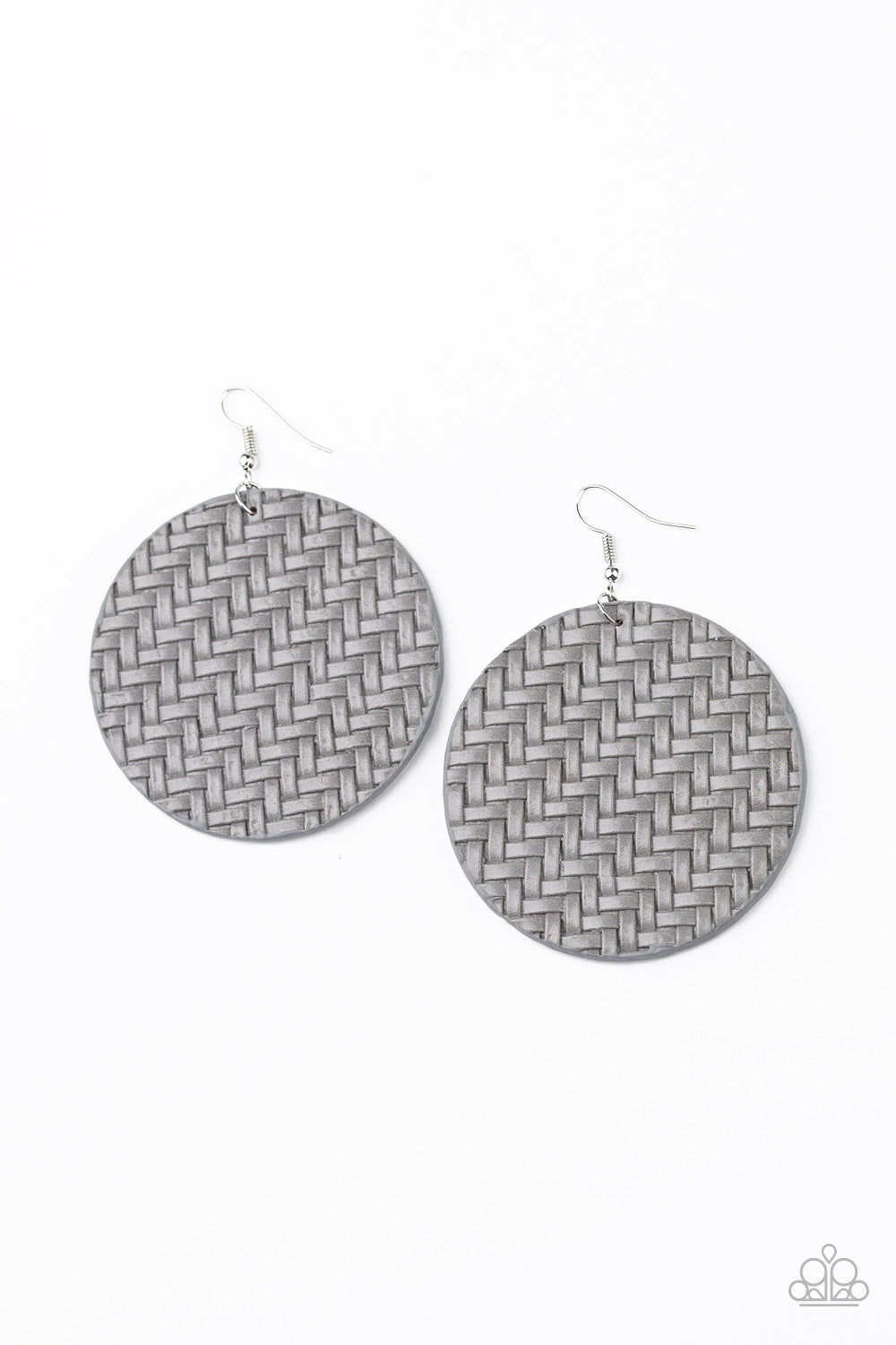 Gray leather-like laces weave into a plaited frame for a seasonal flair. Earring attaches to a standard fishhook fitting.