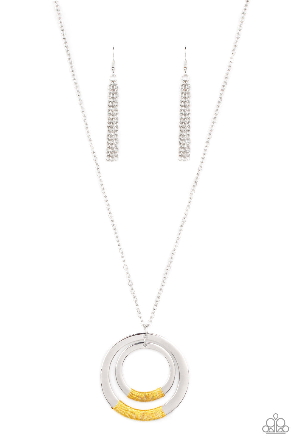 Glitzy yellow thread wraps around the bottoms of two flat silver hoops, creating a dizzying pendant at the bottom of an extended silver chain. Features an adjustable clasp closure.