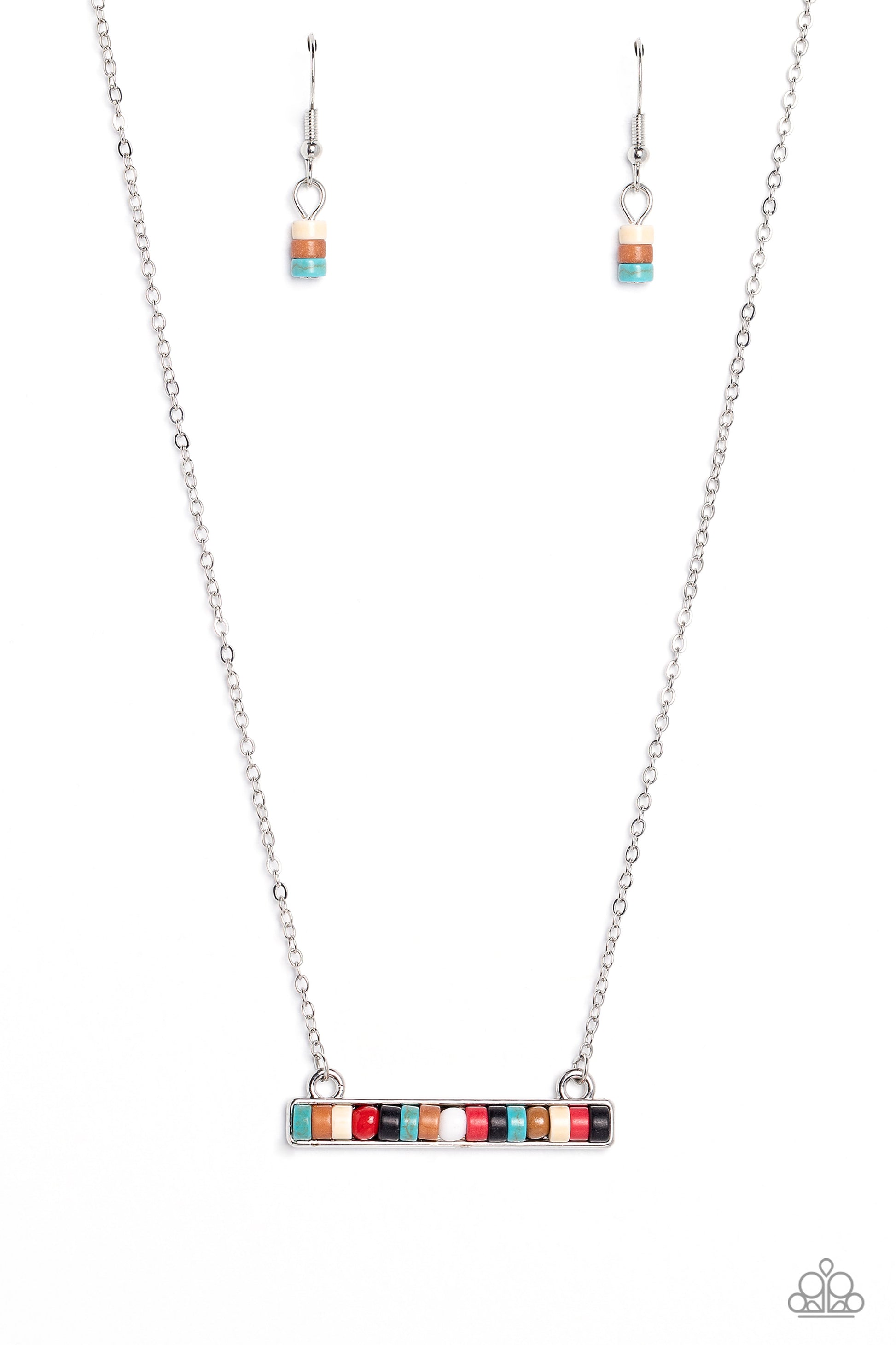 Cascading from a dainty silver chain, a collection of earthy turquoise, adobe, white, red, and black stone discs and beads are set in a square silver bar setting, creating an understated, harmonious display. Features an adjustable clasp closure. As the stone elements in this piece are natural, some color variation is normal.