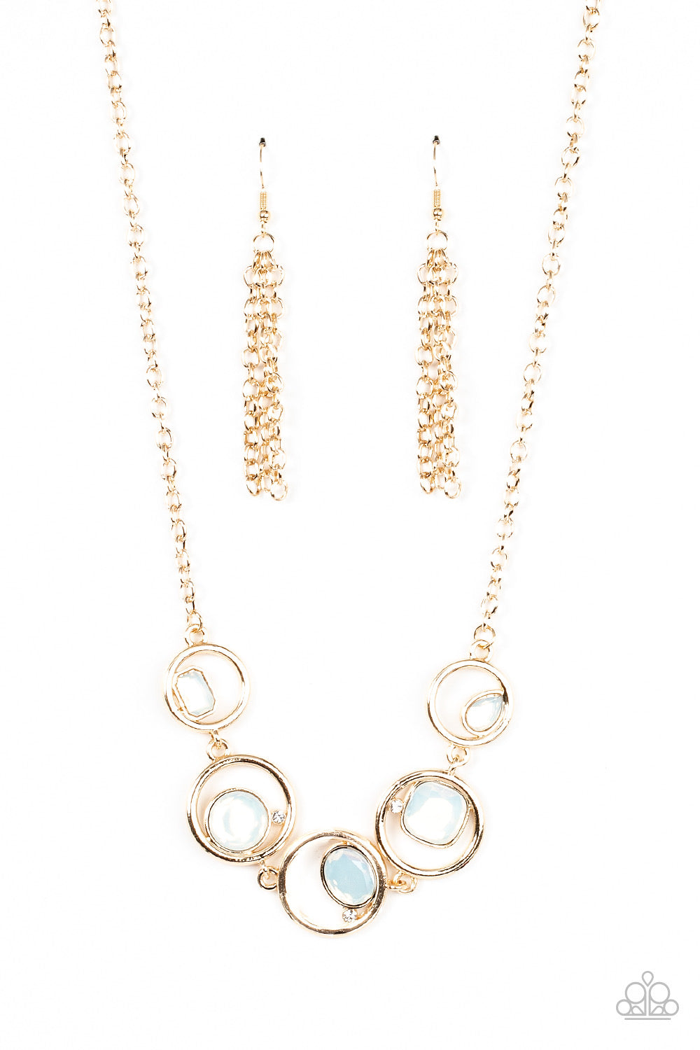 Sporadically infused with dainty white rhinestones, a glittery collection of round, teardrop, and emerald cut opal rhinestones haphazardly adorn the centers of interlocking gold hoops below the collar for a mesmerizing finish. Features an adjustable clasp closure.