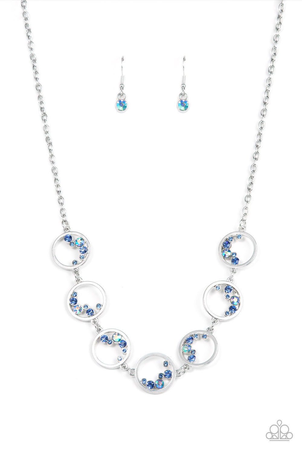 A dainty series of shiny silver rings are sporadically dotted in bubbly rows of glassy and iridescent blue rhinestones as they delicately link below the collar, resulting in an effervescent display. Features an adjustable clasp closure.
