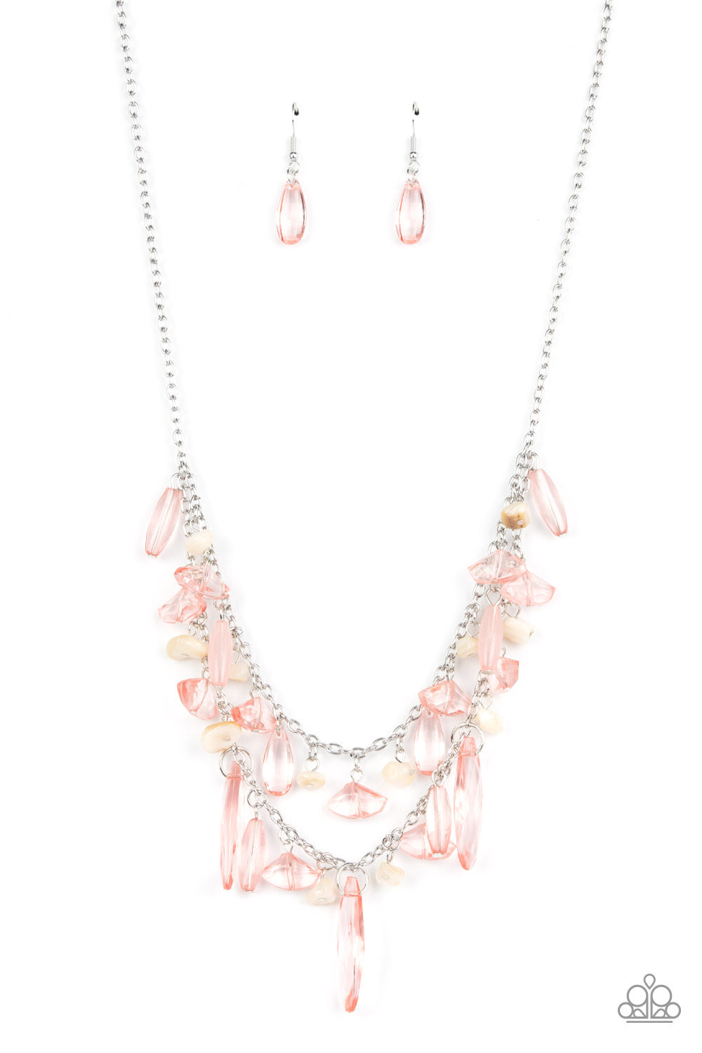 Pearly white pebbles and an assortment of Pale Rosette crystal-like beads trickle from two silver chains, creating a prismatically layered look below the collar. Features an adjustable clasp closure.