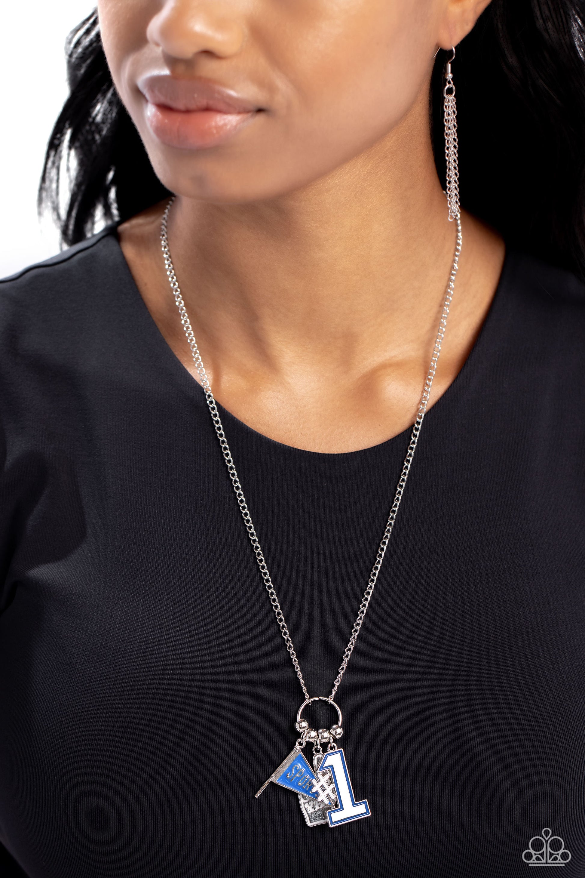 Cascading from a silver hoop, a white-painted foam finger charm with the stamped word "yay," a blue and white-painted "#1" charm, a "Sports"-stamped blue flag, and silver studs coalesce into an athletic-inspired centerpiece down the chest. Features an adjustable clasp closure.
