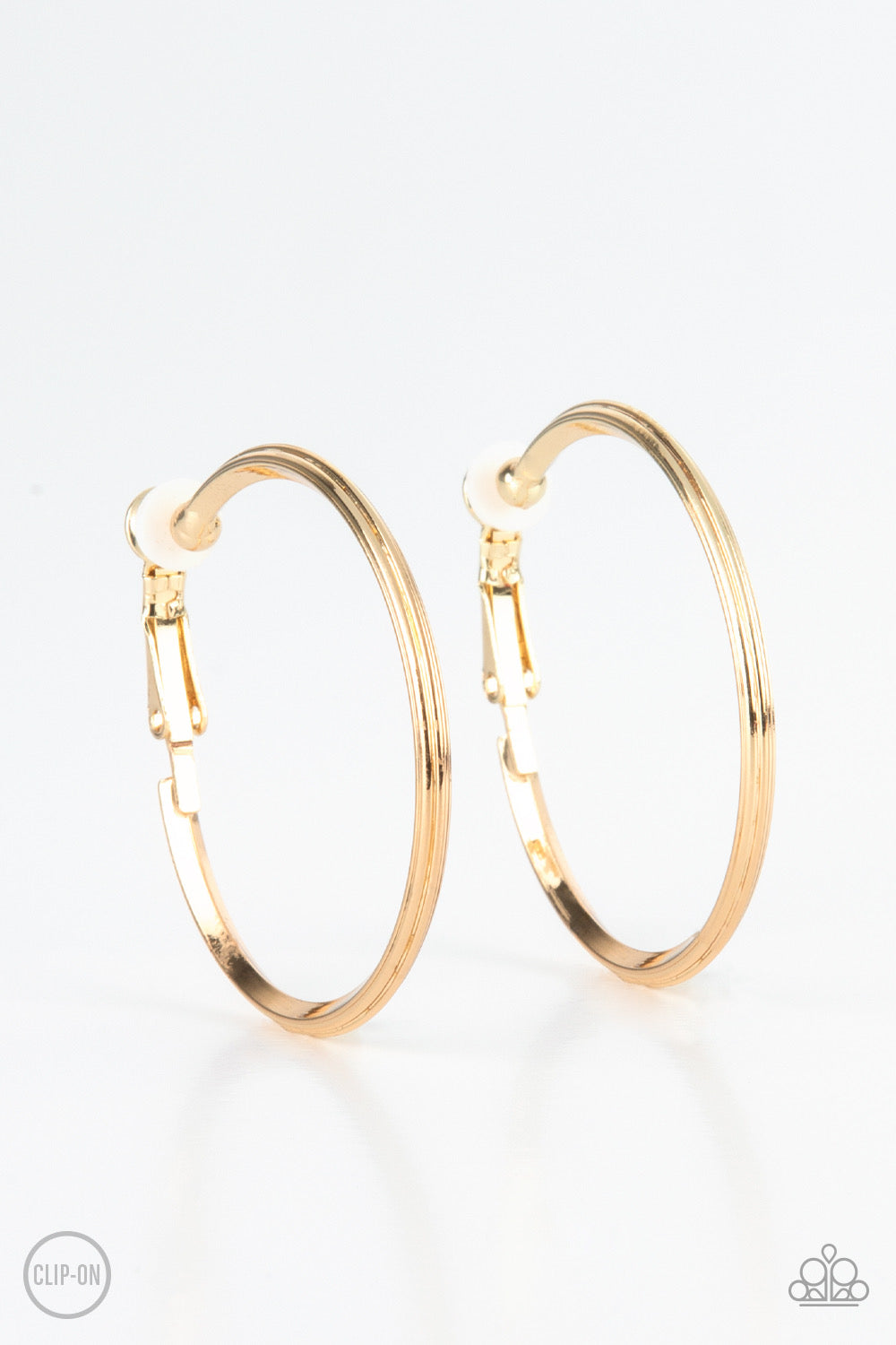 Etched in fine lines, a beveled gold hoop curls around the ear for a classic look. Hoop measures approximately 1 1/2" in diameter. Earring attaches to a standard clip-on fitting.