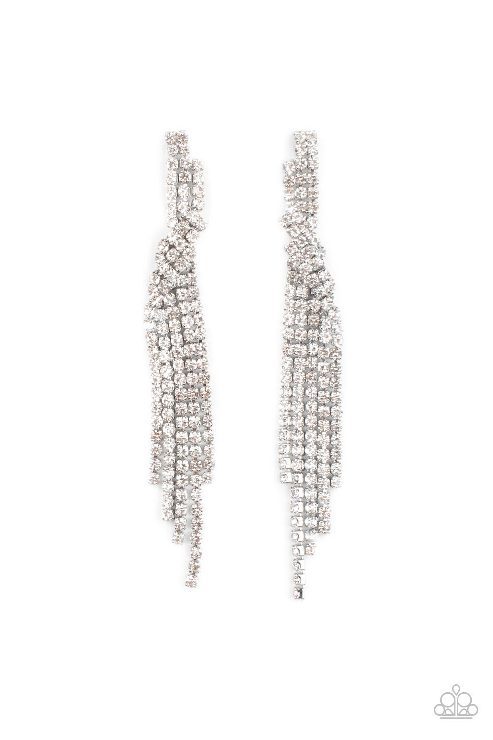 Encased in sleek silver fittings, dainty strands of glittery white rhinestones delicately overlap into a tapered tassel for a twinkly look. Earring attaches to a standard post fitting.