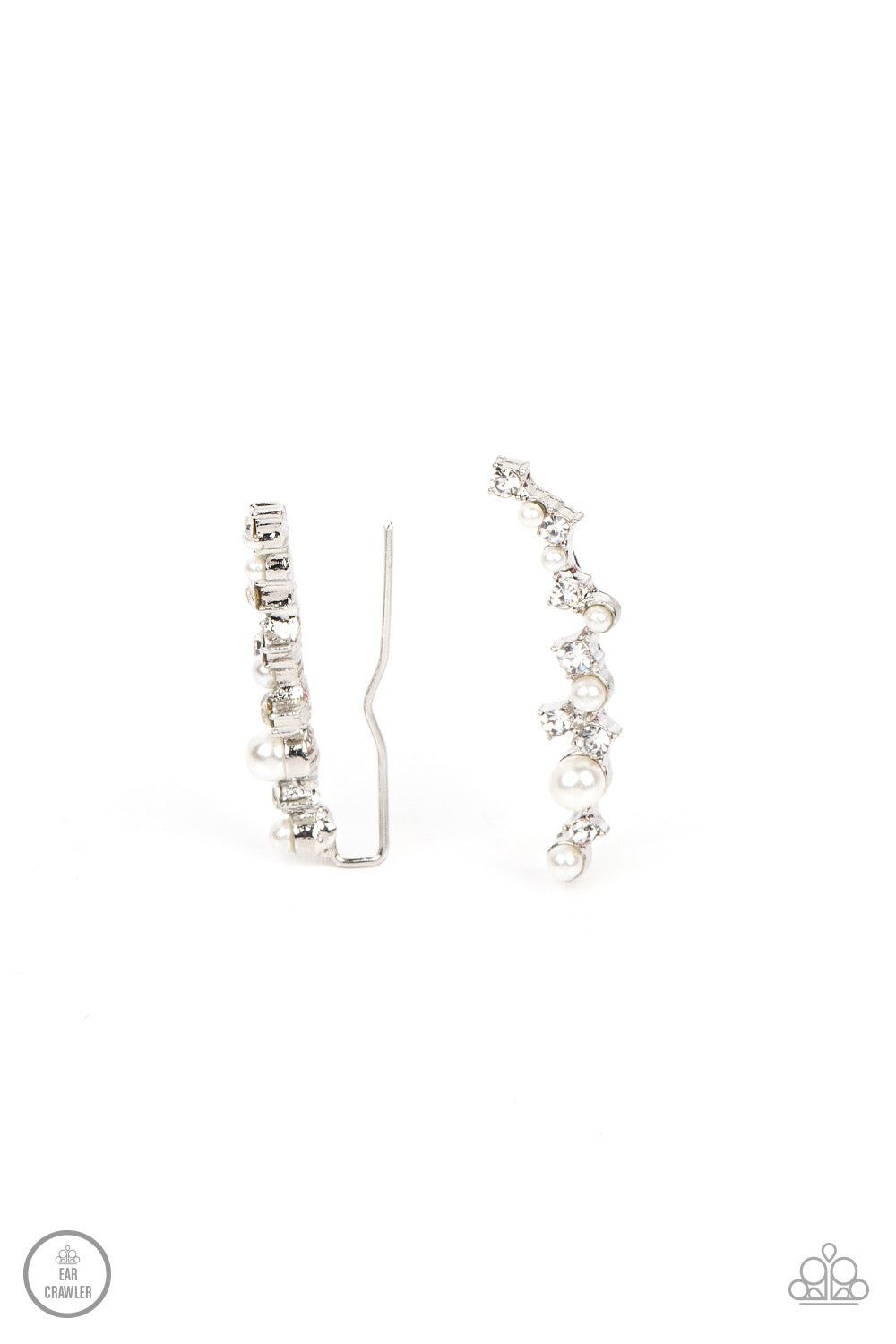 A bubbly assortment of dainty white rhinestones and white pearls gently climbs the ear for a timeless fashion statement. Features an extended post fitting that climbs the back of the ear and can be pressed together for a more secure fit.