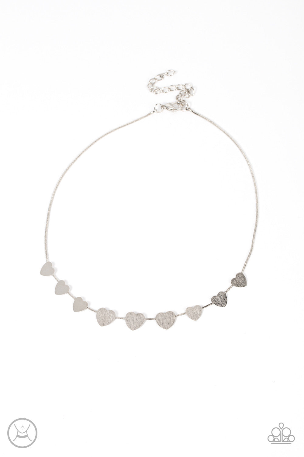 Delicately scratched in shimmer, a dainty collection of flat silver heart frames gradually increases in size along a shiny silver snake chain around the neck for a flirtatious fashion. Features an adjustable clasp closure.
