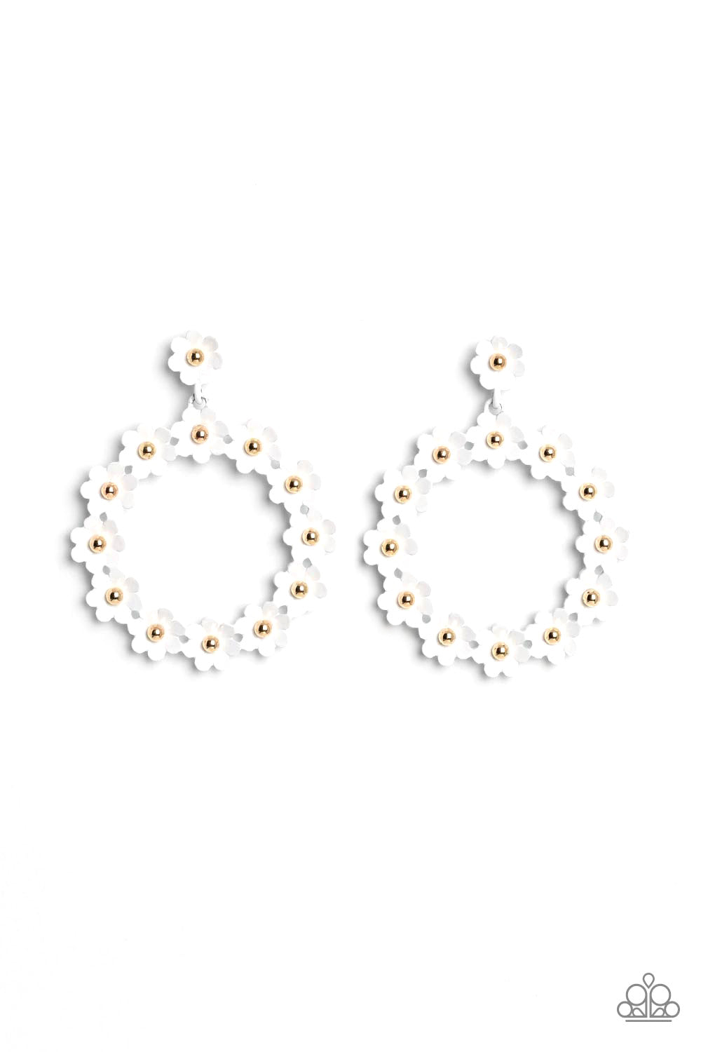 Hanging from a solitaire white daisy, a dainty collection of white daisies bloom into a free-spirited wreath below the ear. Gold studs gleam from the centers of the tactile flowers, adding an industrial sheen to the display. Earring attaches to a standard post fitting.