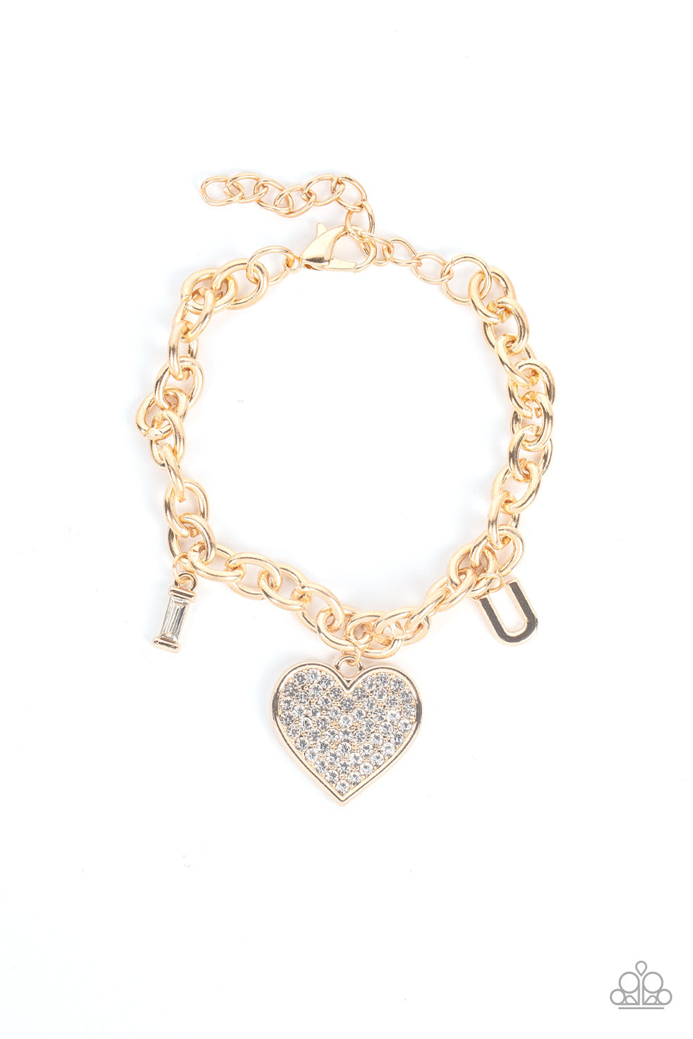 A gold heart frame brimming with brilliant dainty white rhinestones dangles from a chunky gold chain between two gold letter charms. The letter "I" is created from an emerald cut rhinestone framed in gold and the letter "U" is a simple gold bar bent into shape creating a lovely sentiment around the wrist. Features an adjustable clasp closure.