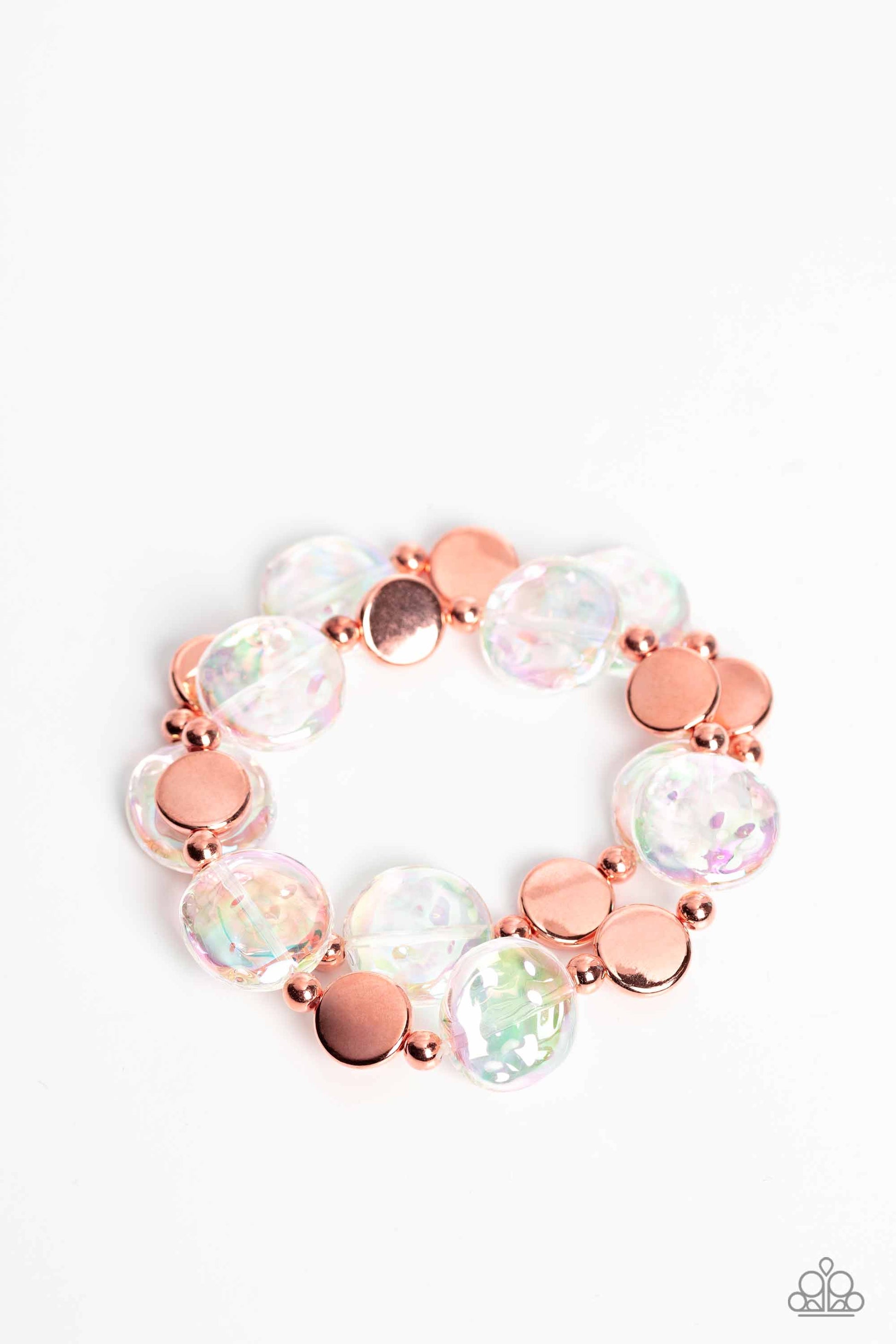 Shiny copper discs, studs, and asymmetrical clear discs featuring an iridescent shimmer coalesce around the wrist on elastic stretchy bands for an attention-grabbing shimmer. Due to its prismatic palette, color may vary.