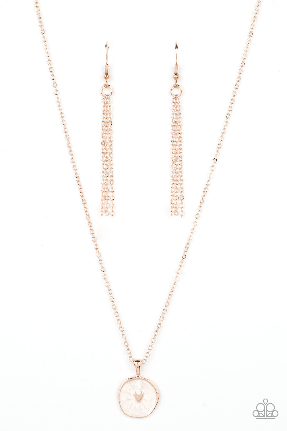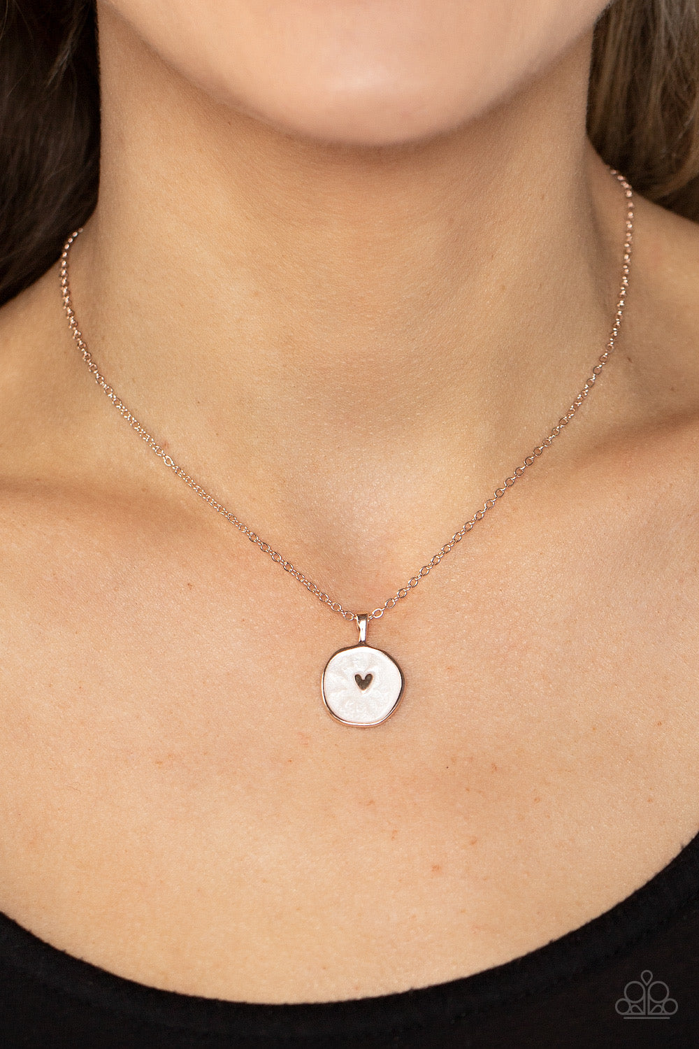 Painted in a shimmery white lacquer finish, an asymmetrical rose gold disc is dotted in a dainty rose gold heart accent as it swings from the bottom of a dainty rose gold chain below the collar for a charming finish. Features an adjustable clasp closure.