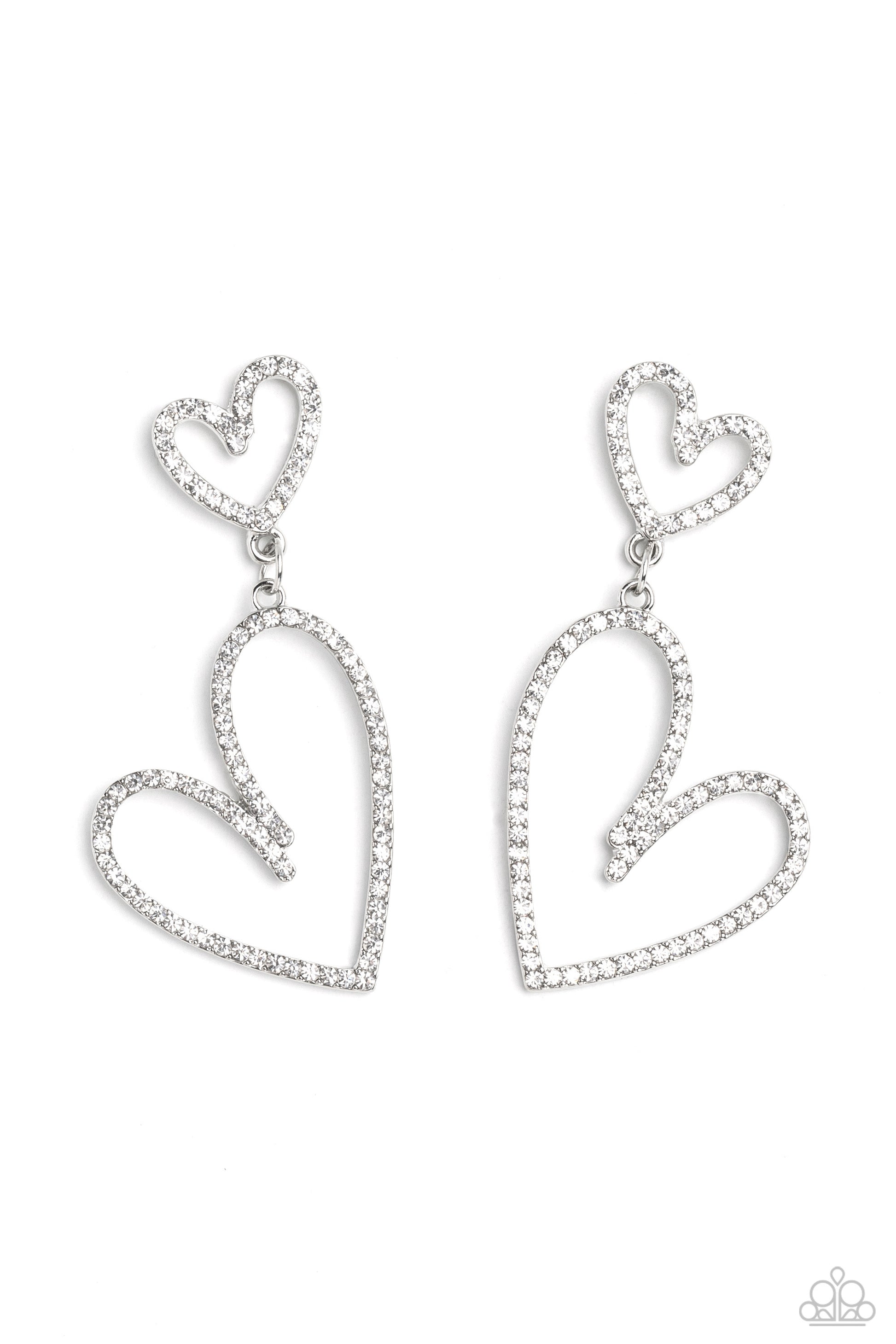An oversized, rhinestone-encrusted shiny silver heart silhouette hangs from a smaller heart silhouette set in the same blinding shimmer for a romantic, eye-catching sparkle. Earring attaches to a standard post fitting.