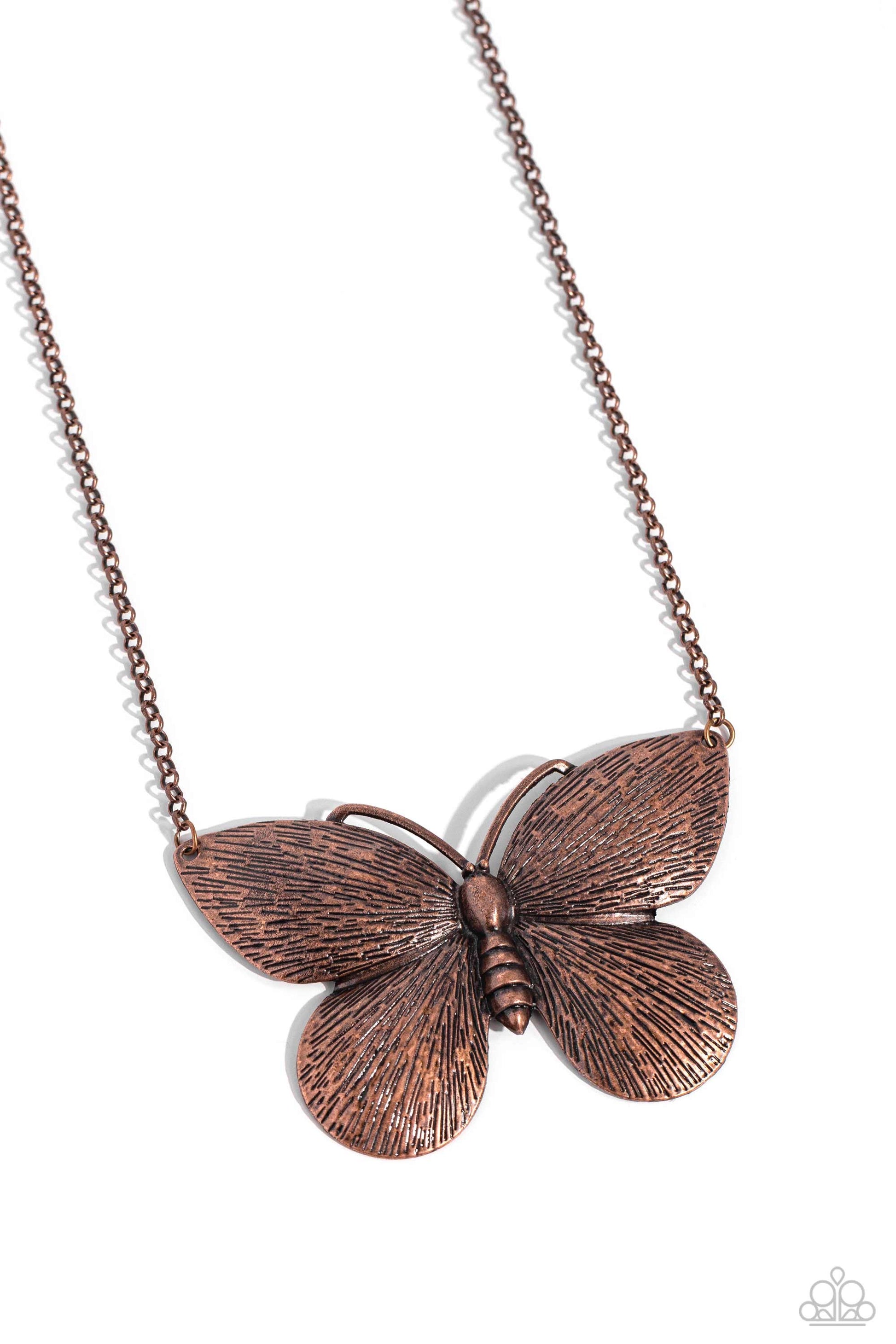 Brushed in a linear texture, an exaggeratedly large copper moth plate flutters along a copper chain below the collar for an enchanting fashion. Features an adjustable clasp closure.