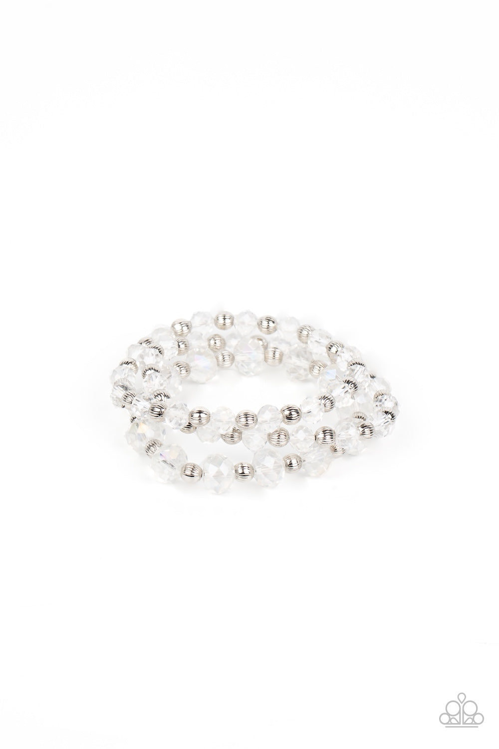 Varying in size, an explosion of glassy iridescent crystal-like gems and ornate silver beads are threaded along stretchy bands around the wrist for a glamorous fashion.