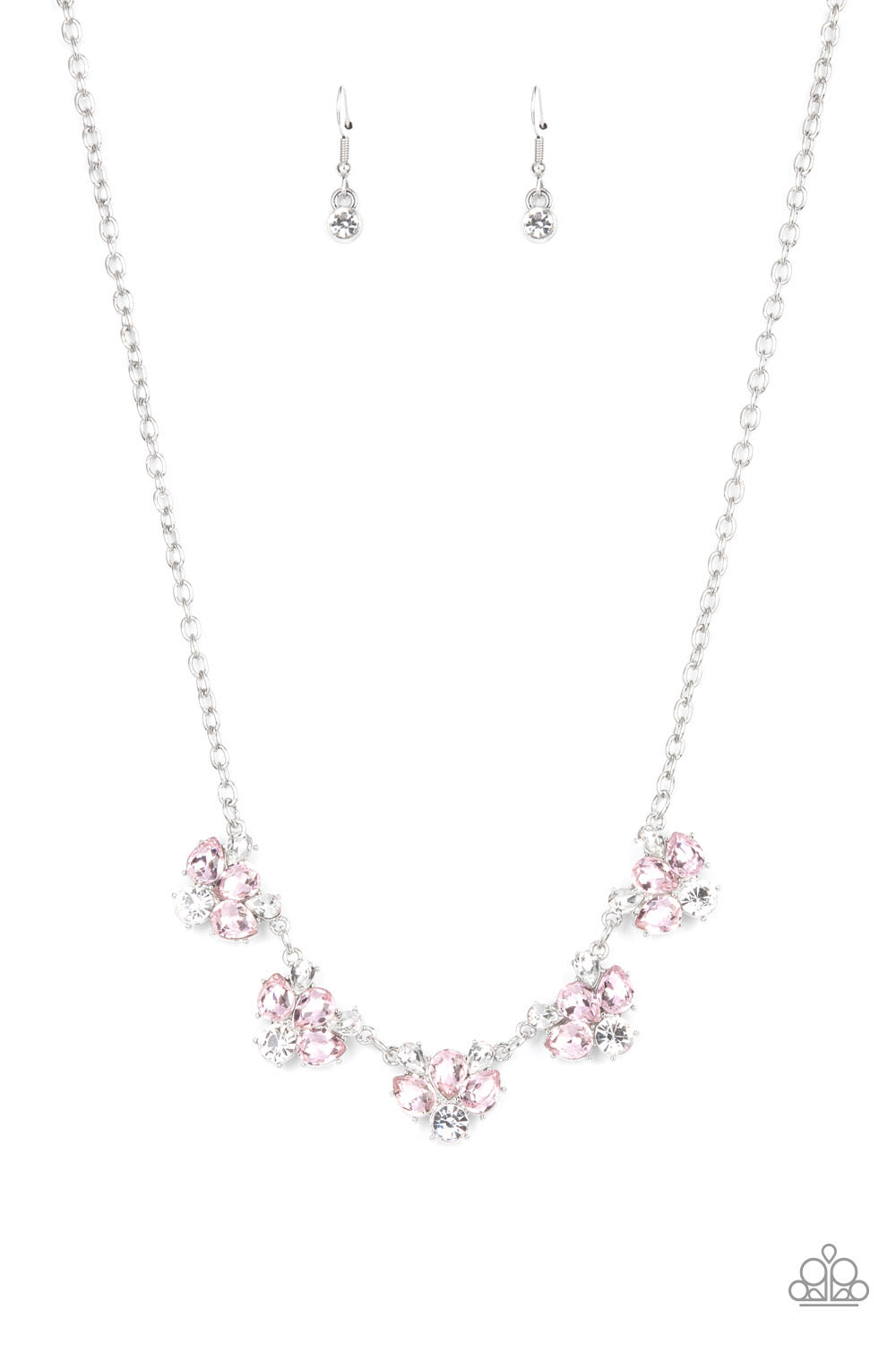 Featuring round and teardrop cuts, white and pink rhinestones delicately link into a sparkling statement piece that results into an envious glow below the collar. Features an adjustable clasp closure.