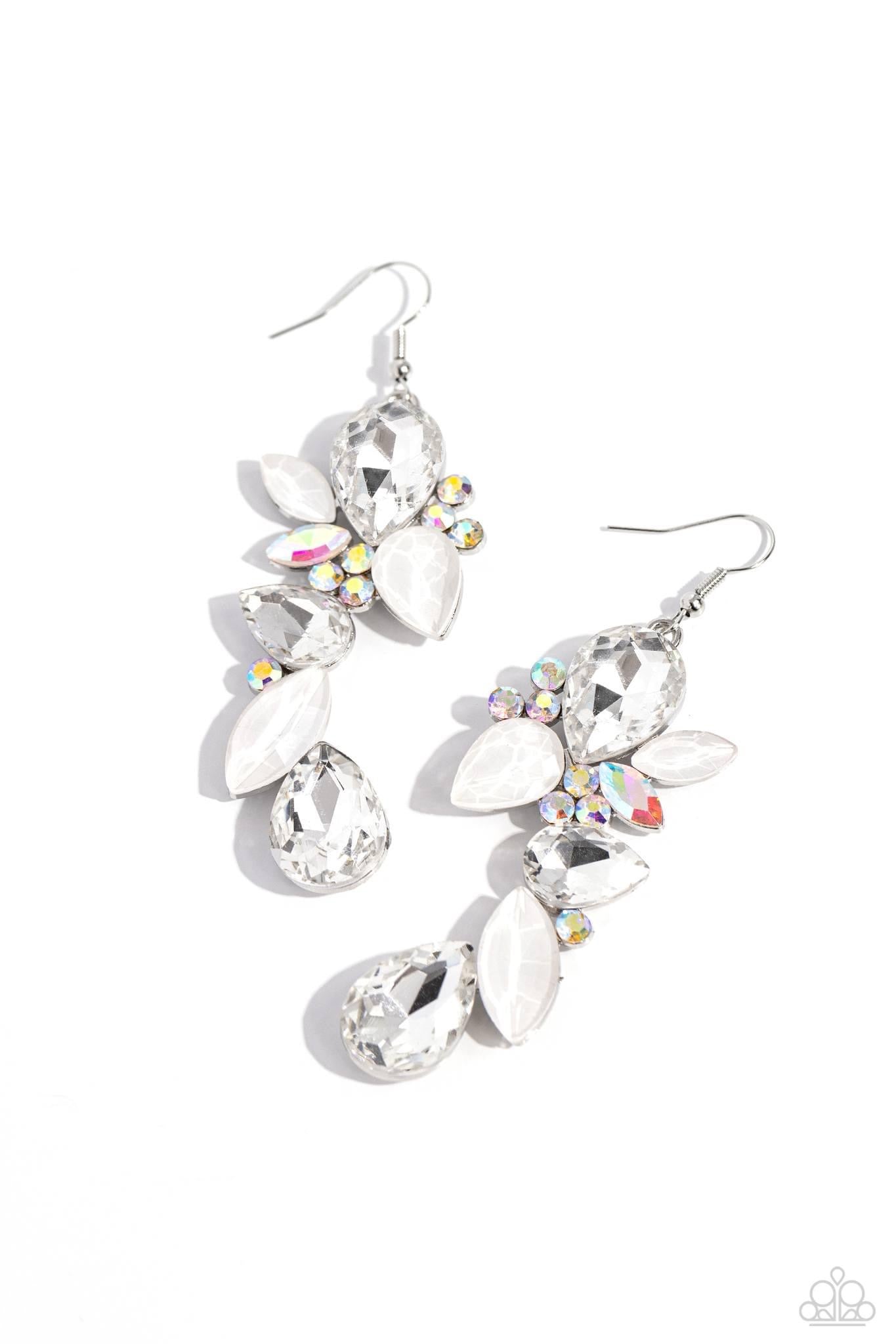 Featuring various shades of white, a glittery collection of oversized teardrop, round, and marquise-cut gems cluster and curve in place along the ear, creating a glamorous lure. Dainty iridescent rhinestones sporadically dot across the canvas, further drawing the eye to the faceted oversized detail. Earring attaches to a standard hanging fishhook fitting. Due to its prismatic palette, color may vary.