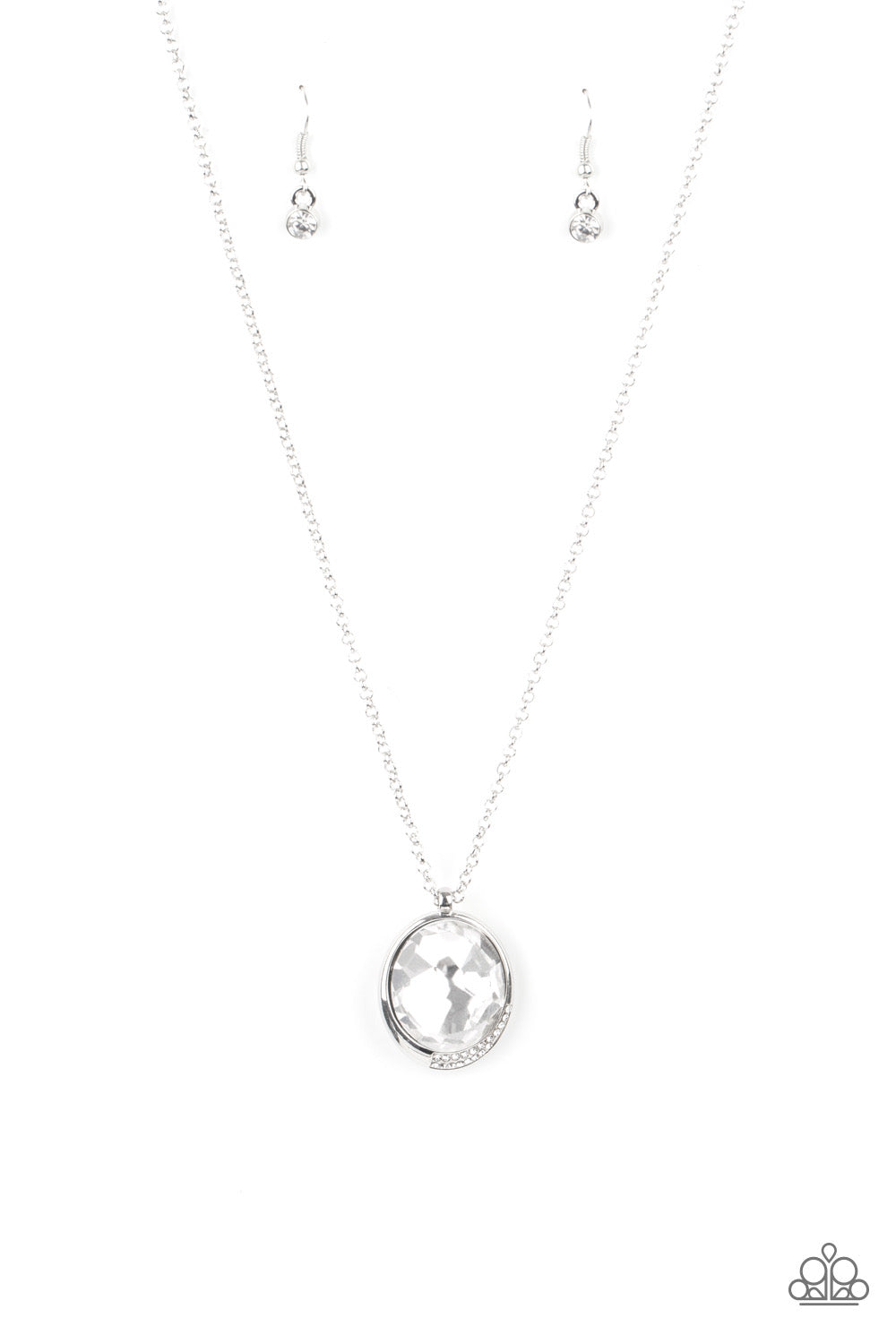 An oversized white gem is pressed into a sleek silver fitting dipped in dainty white rhinestones, creating a glamorous pendant at the bottom of a dainty silver chain. Features an adjustable clasp closure.