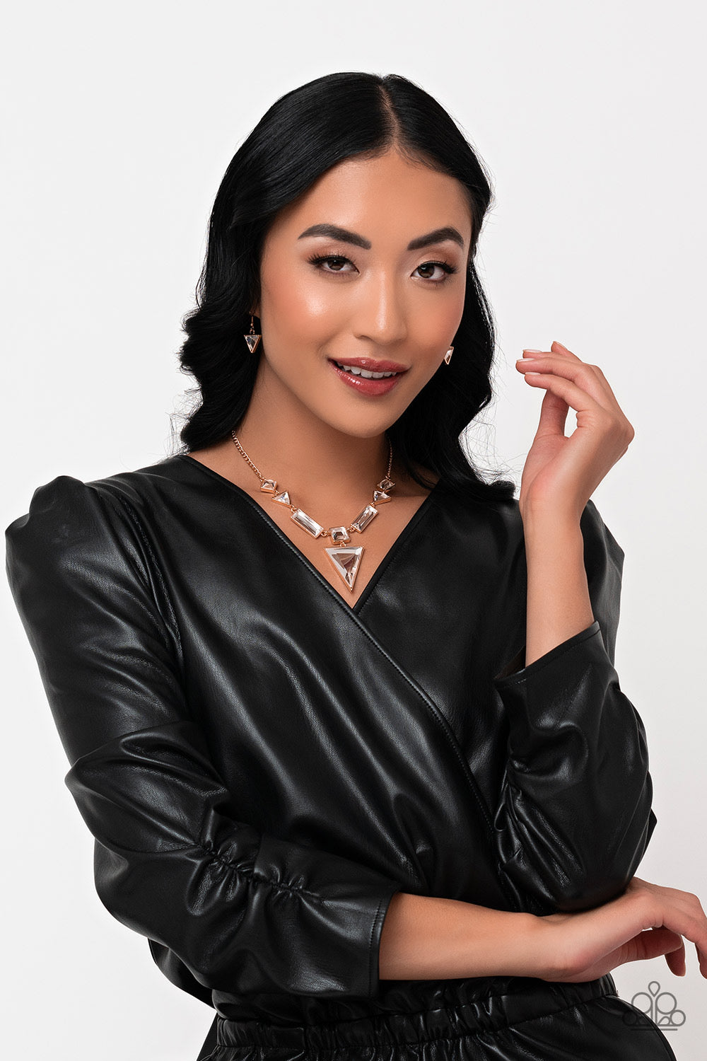 An array of glassy white gems are chiseled into geometric shapes and pressed into shimmery gold frames. The angular display falls to a dramatic point at the center, where a square-cut gem anchors an upside-down triangular pendant for a flawless finish. Features an adjustable clasp closure.