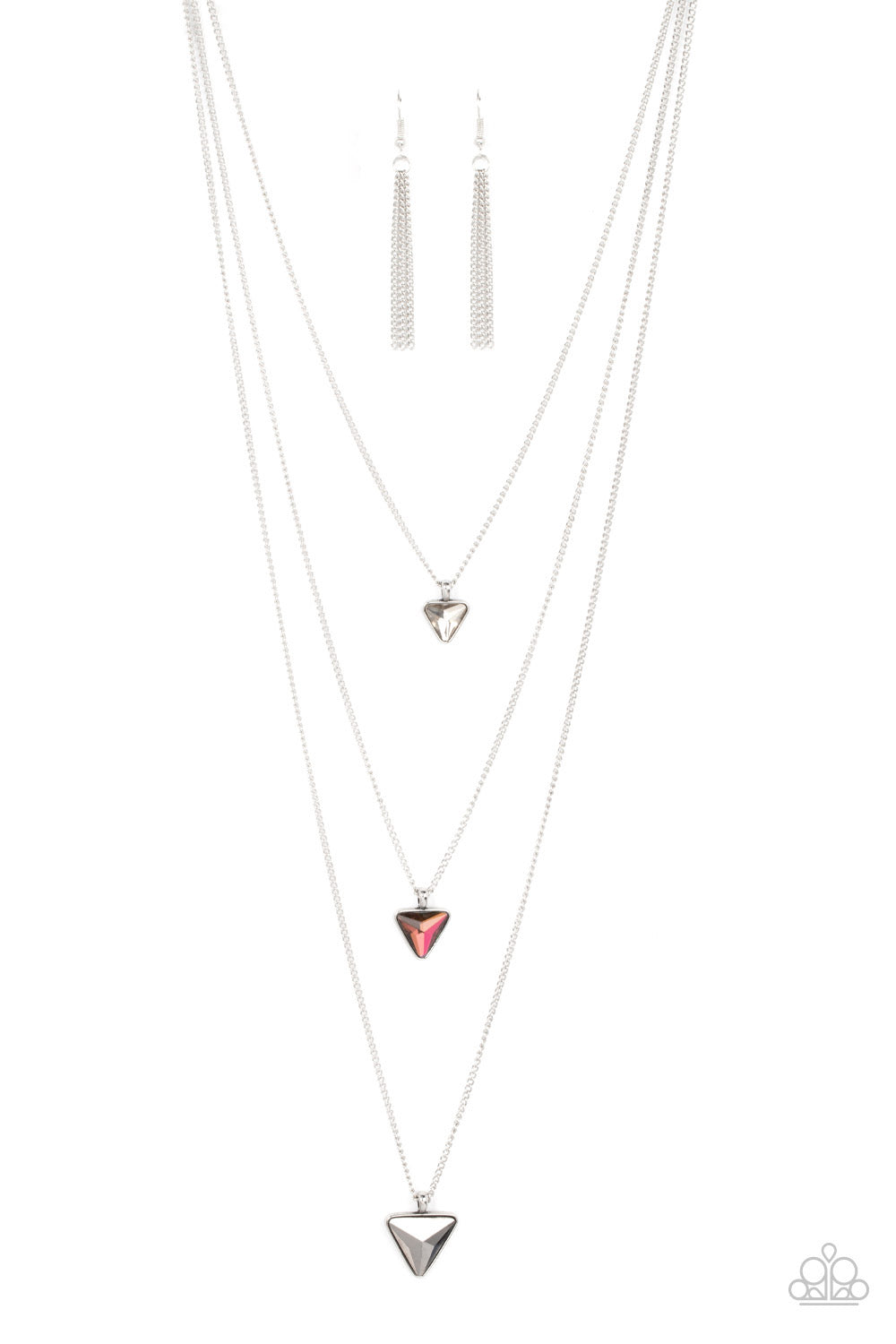 Glassy white, oil spill, and hematite triangular gems gradually increase in size as they swing from the bottoms of extended silver chains, layering into an edgy shimmer across the chest. Features an adjustable clasp closure.