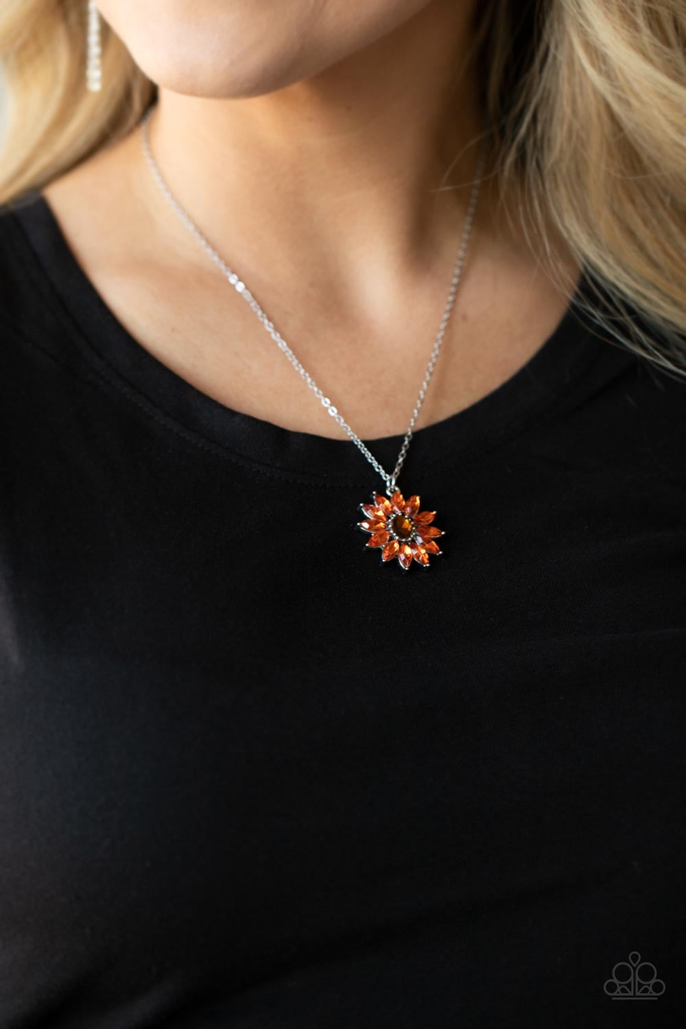 Glittery orange marquise cut rhinestones fan out from an oval topaz rhinestone center, creating a fabulous floral pendant at the bottom of a dainty silver chain. Features an adjustable clasp closure.