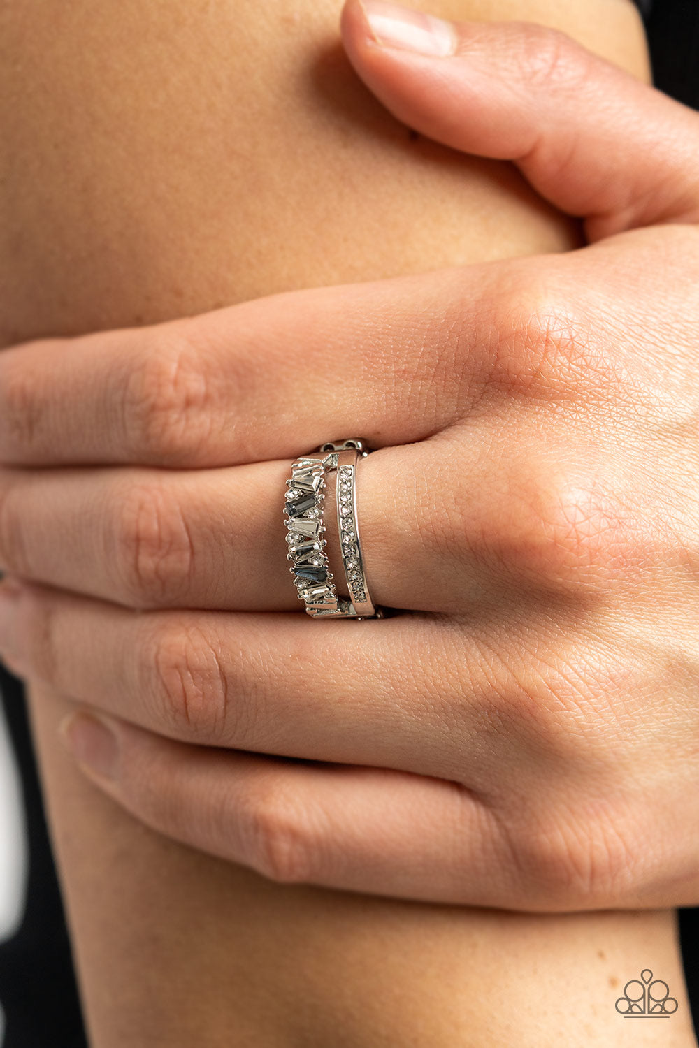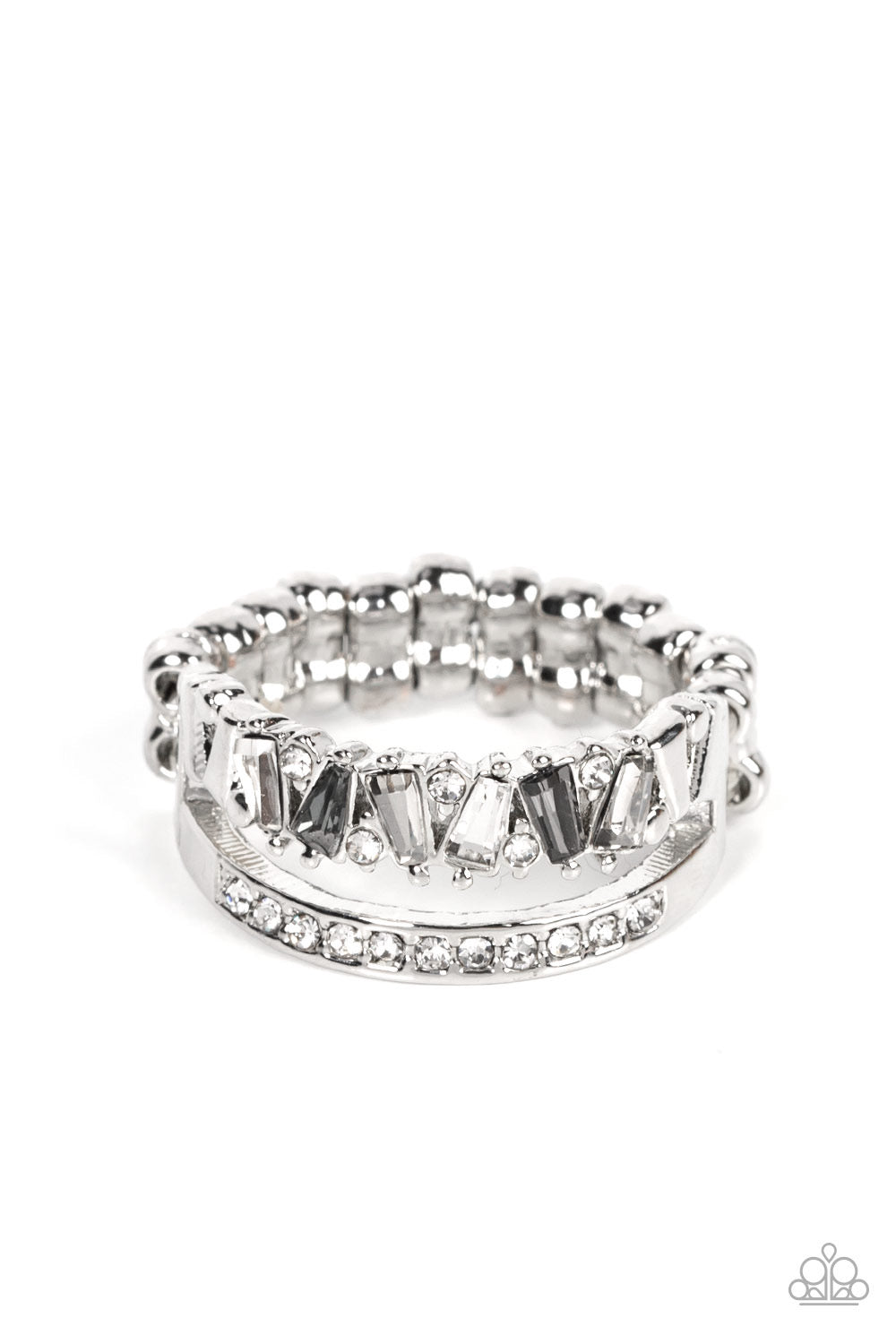 Infused with a timeless band of white rhinestones, a dainty collection of trapezoidal cut smoky and white rhinestones staggers across the finger for a glamorously layered look. Features a dainty stretchy band for a flexible fit.