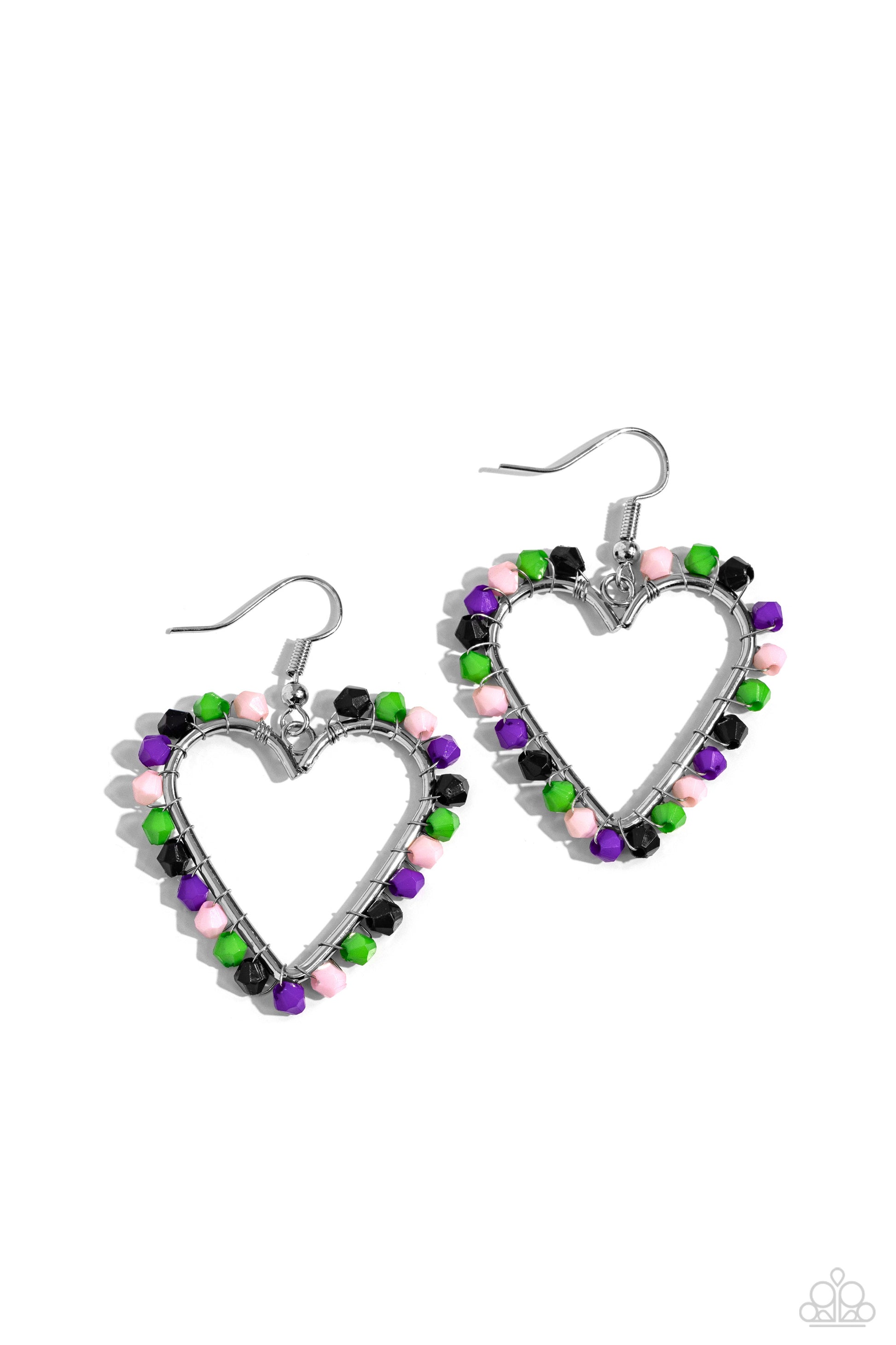 A vibrant collection of black, Classic Green, baby pink, and purple seed beads are wrapped along the outside curve of a shiny, silver heart frame by shimmery silver wire for a handcrafted, fun-loving finish. Earring attaches to a standard fishhook fitting.