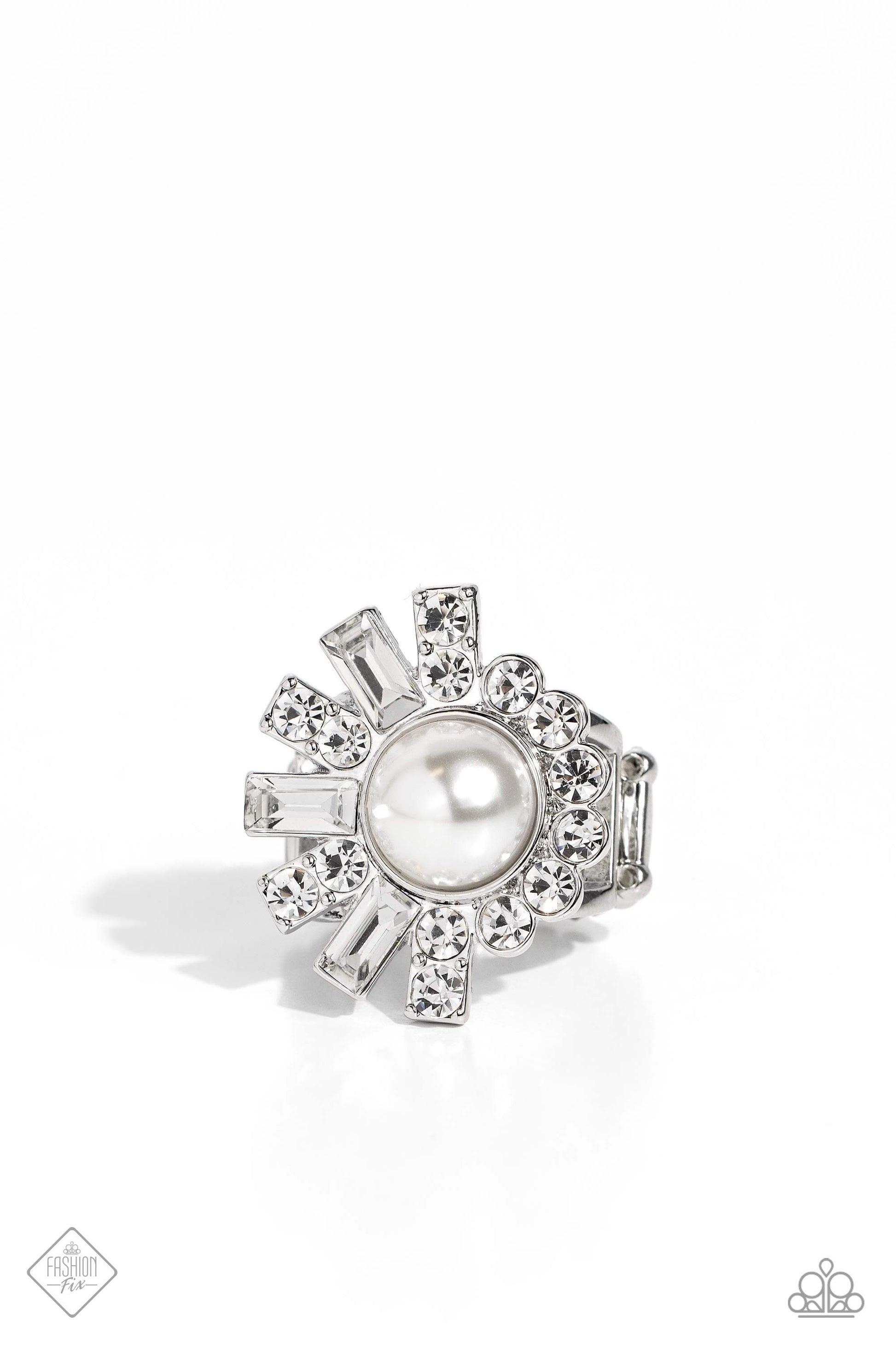 A curved row of white rhinestones collide with flared bars of silver that lay on the opposite side and form into a sunburst shape atop airy silver bands. The flared bars alternate between stacked white rhinestones and emerald-cut white gem bars, offsetting the pearly sheen of the center of the ring, creating an abstract blend of dazzle and glitz. Features a stretchy band for a flexible fit.