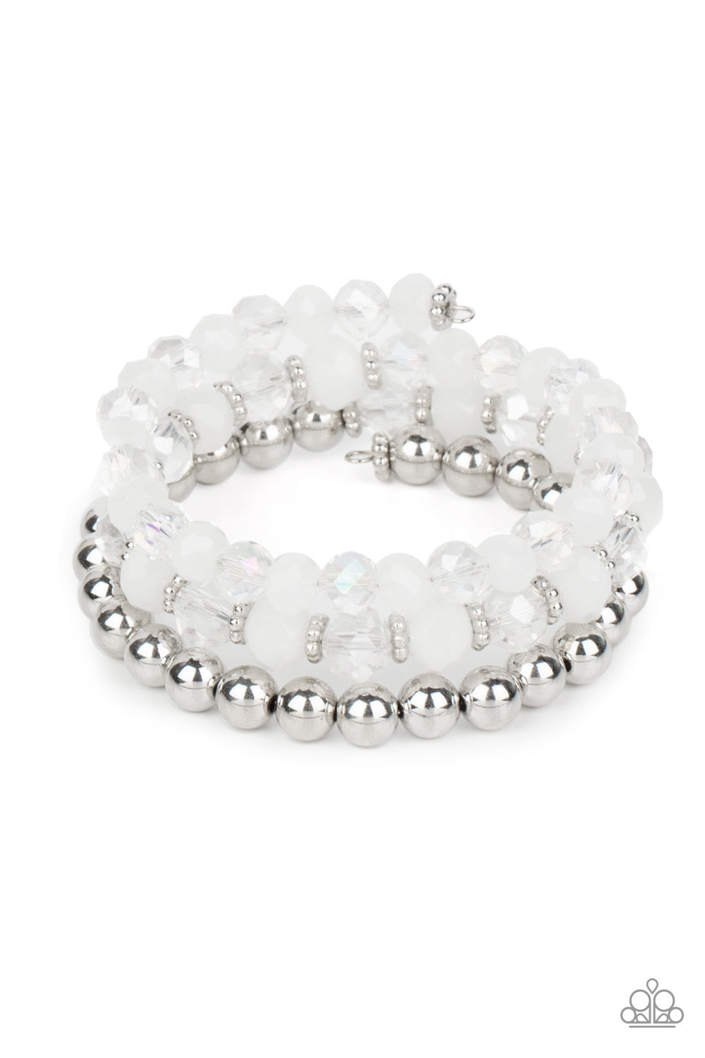 Sections of shiny silver beads and an alternating pattern of opaque and glittery white rhinestone gems gradually increase in size along a coiled wire, creating a jaw-dropping infinity wrap bracelet around the wrist.