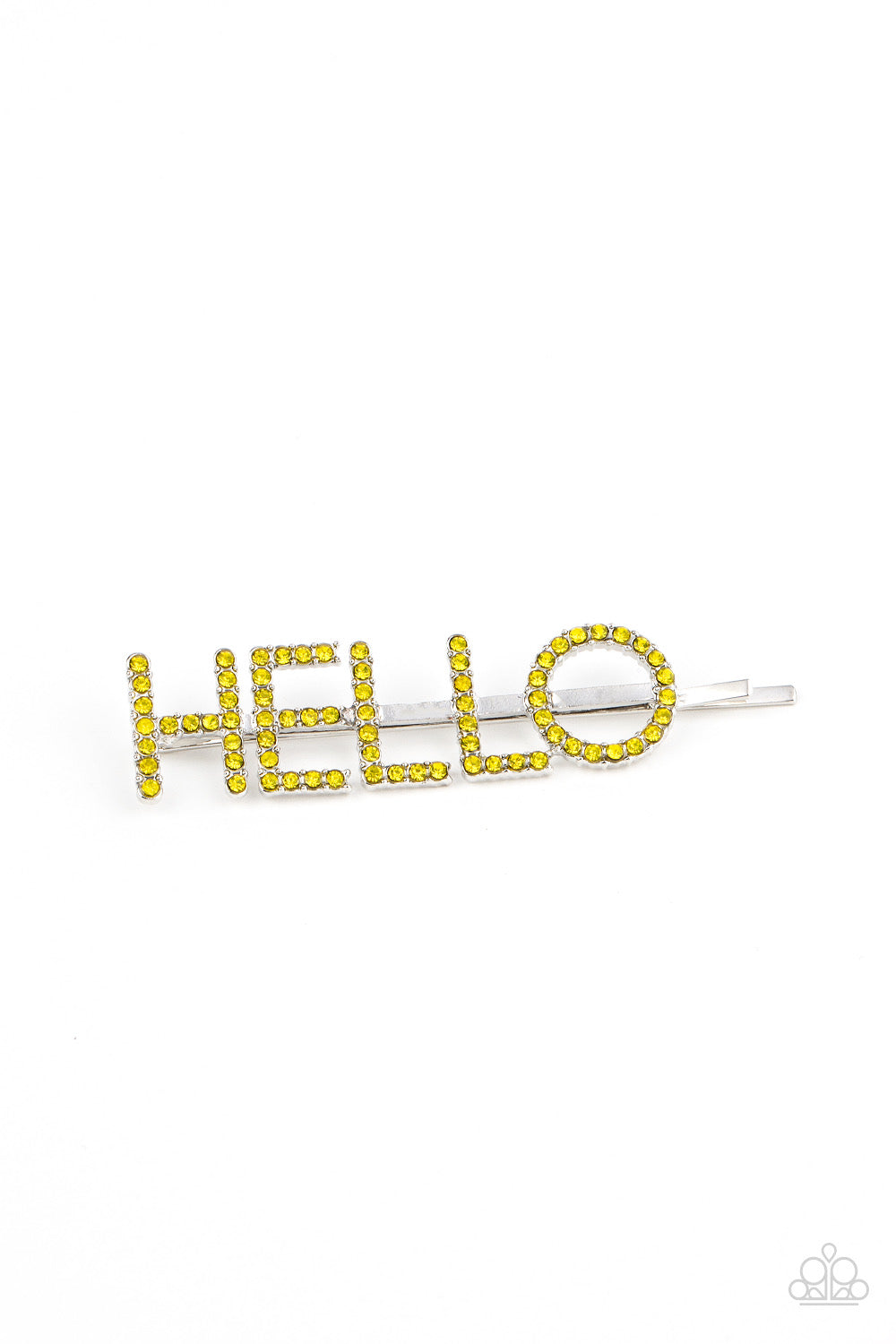 Encrusted in glittery Illuminating rhinestones, the word, "Hello," is spelled out across the front of a classic silver bobby pin for a charming look.