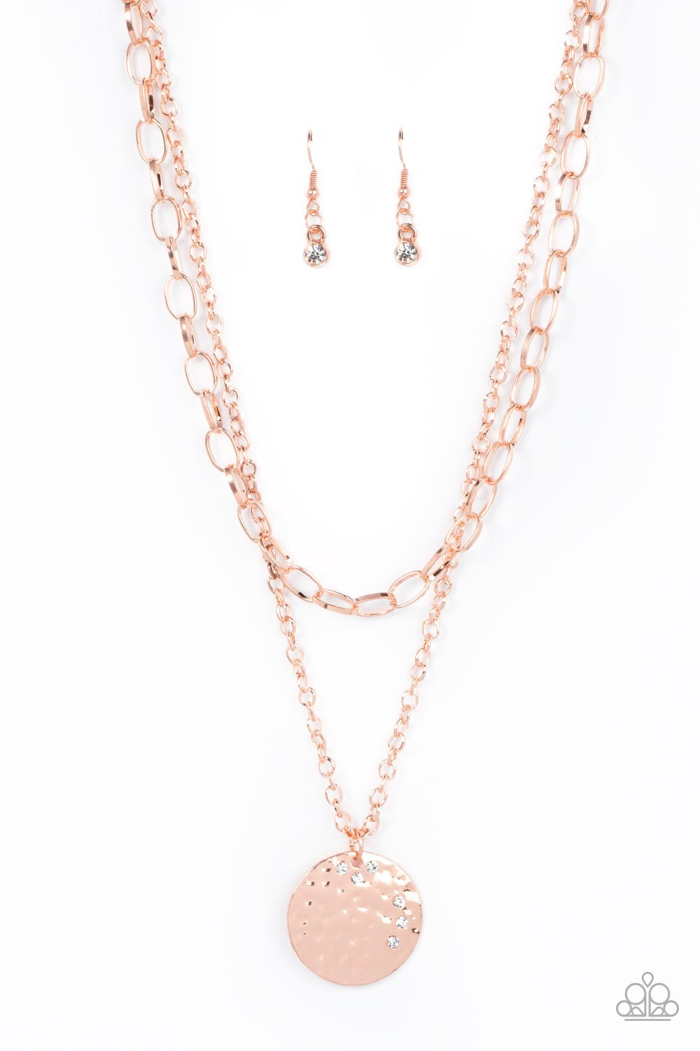 Sporadically dotted in glittery white rhinestones, an oversized hammered shiny copper disc is suspended from the lowermost of two mismatched shiny copper chains below the collar for a retro look. Features an adjustable clasp closure.