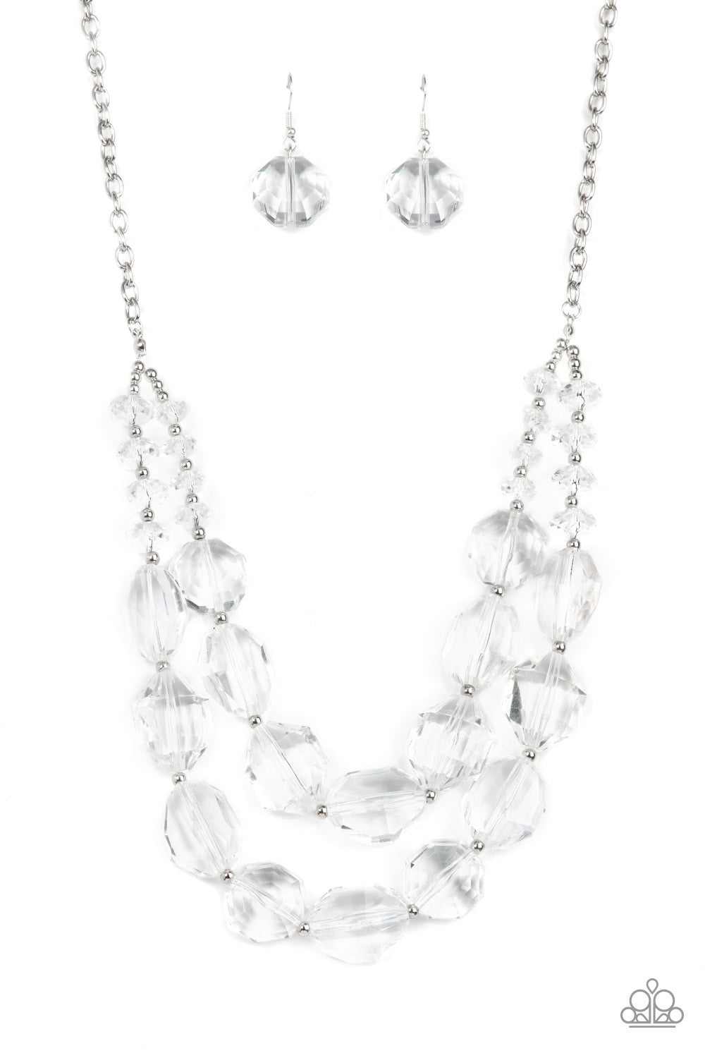 Separated by dainty silver beads, an icy collection of oversized and faceted white gems are threaded along invisible wires below the collar, resulting in prismatic layers. Features an adjustable clasp closure.