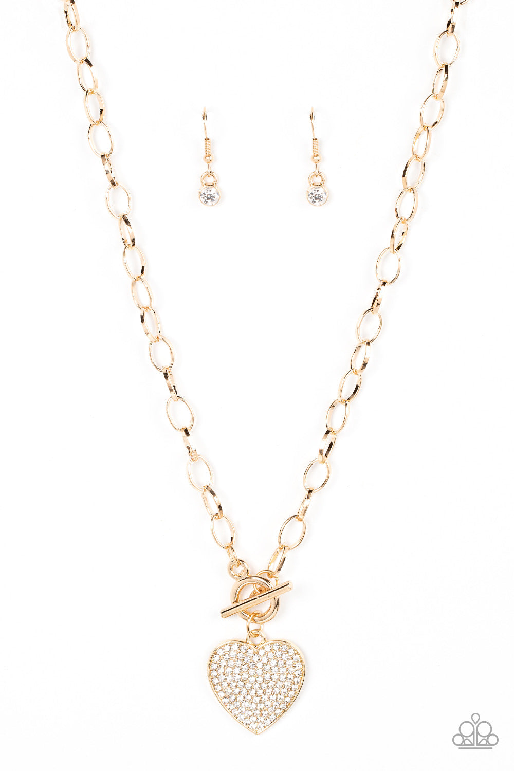 A blinding white rhinestone dotted gold heart frame sparkles from a toggle closure at the center of an oval gold linked chain for a flirtatious fashion. Features a toggle closure.