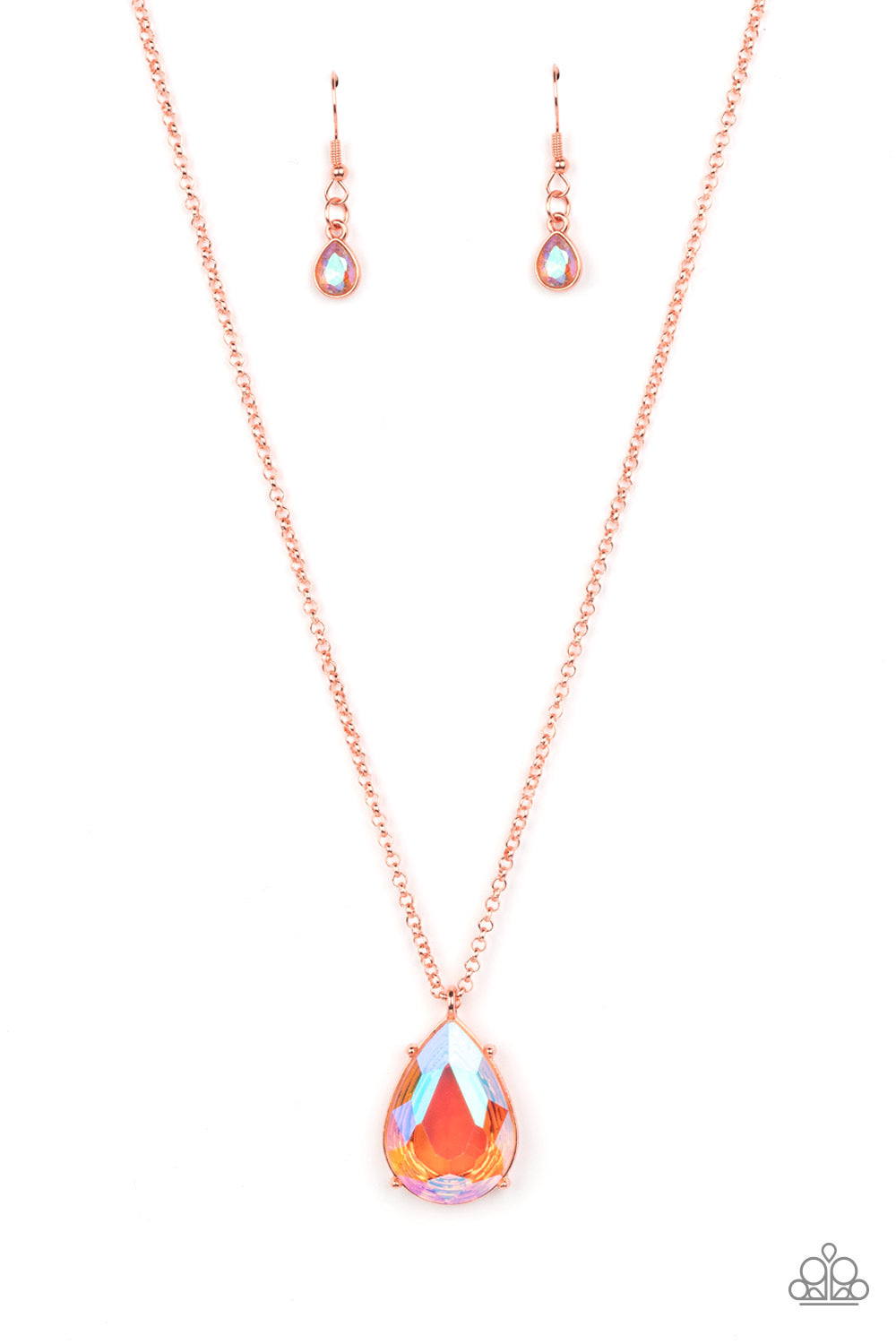 Featuring a pronged fitting, a dramatically oversized iridescent teardrop gem sparkles at the bottom of a shiny copper chain for an iconic fashion. Features an adjustable clasp closure.