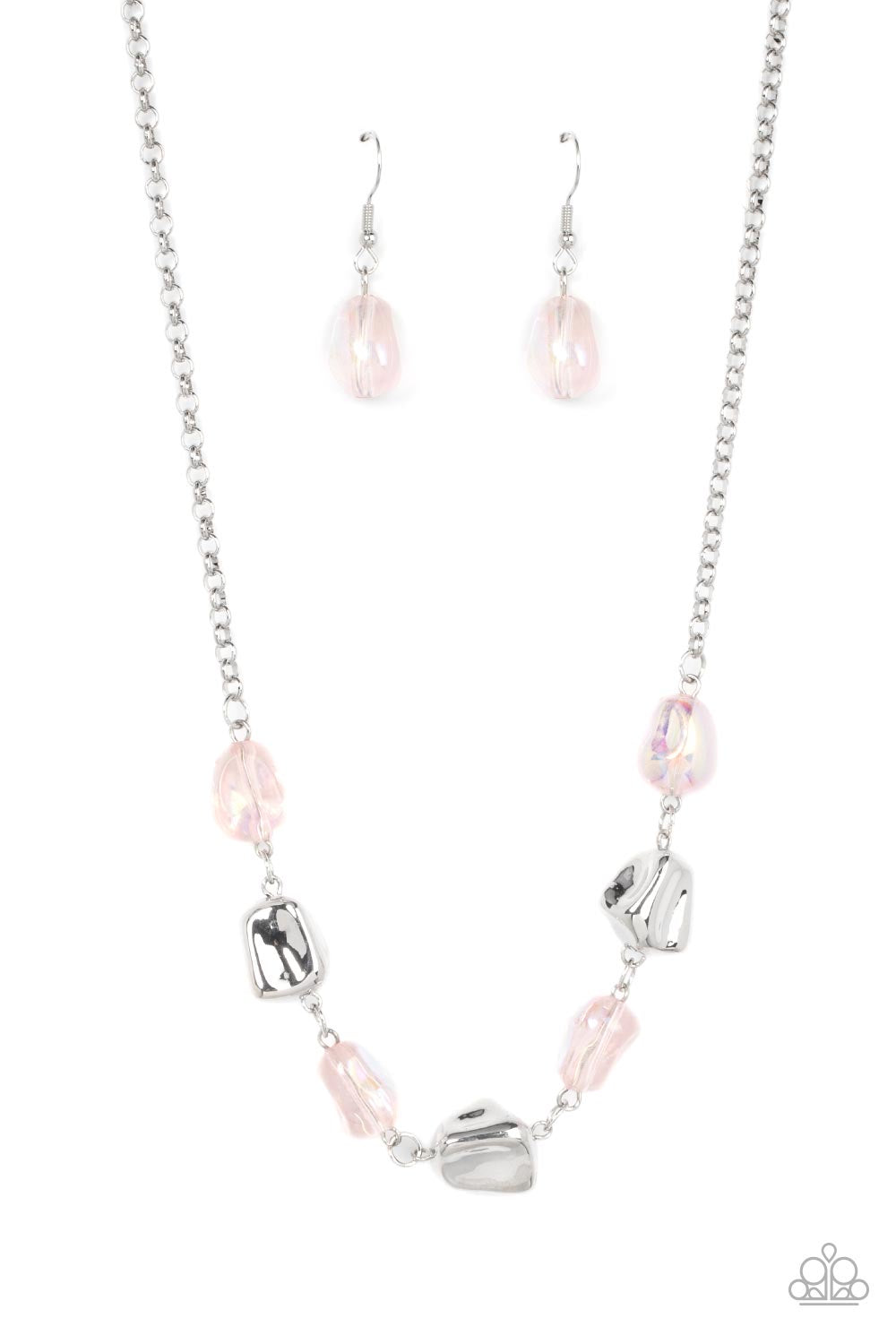 Featuring asymmetrical faceted finishes, a shimmery collection of shiny silver and iridescent pink beads links below the collar for an interstellar inspired fashion. Features an adjustable clasp closure.