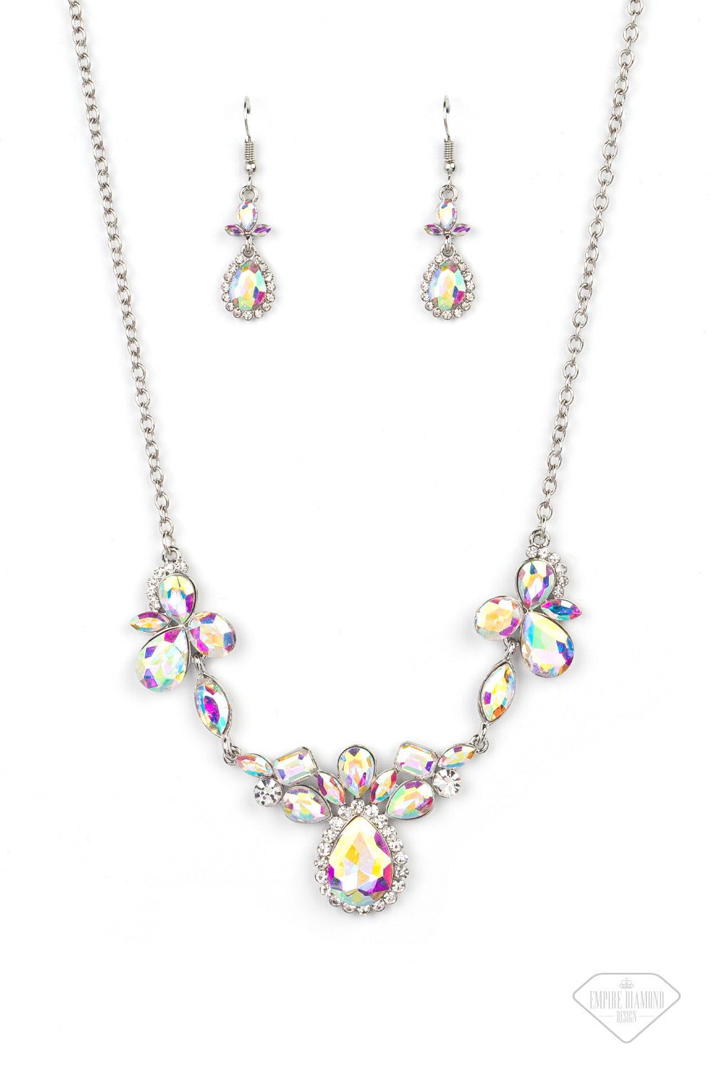 Featuring emerald, oval, teardrop, and marquise style cuts, clusters of iridescent gems brilliantly sparkle below the collar for an out-of-this-world shimmer. Bordered in dainty white rhinestones, the centermost teardrop gem captures the eye while illuminating the other white rhinestones sprinkled through the dauntless design. Features an adjustable clasp closure. Due to its prismatic palette, color may vary.