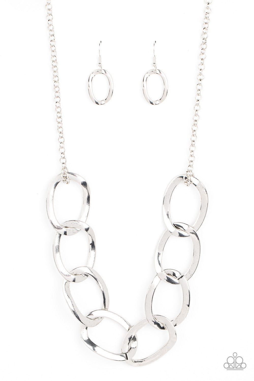 Attached to a classic silver chain, an oversized collection of warped oval links boldly interlocks below the collar for an intense industrial look. Features an adjustable clasp closure.