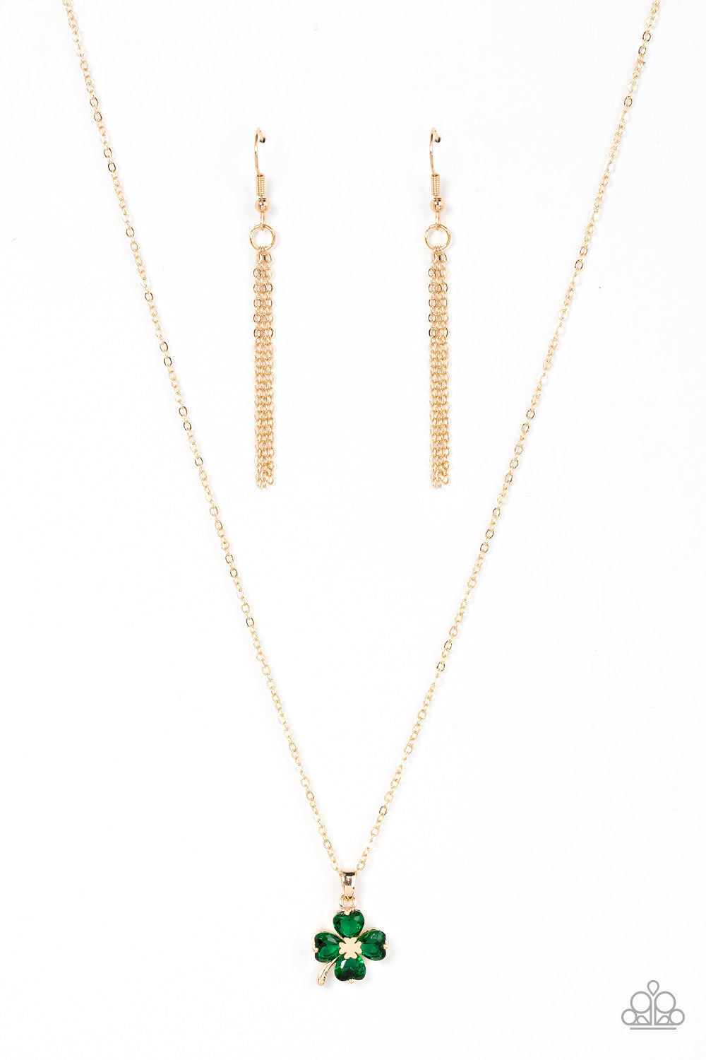 Sparkling with glittery green rhinestones, a golden clover pendant glides along a dainty gold chain below the collar for a dazzling dash of St. Patrick's Day inspiration. Features an adjustable clasp closure.