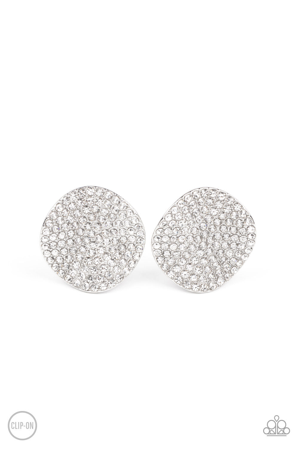 The front of a warped silver disc is encrusted in row after row of blinding white rhinestones, resulting in a refined display. Earring attaches to a standard clip-on fitting.