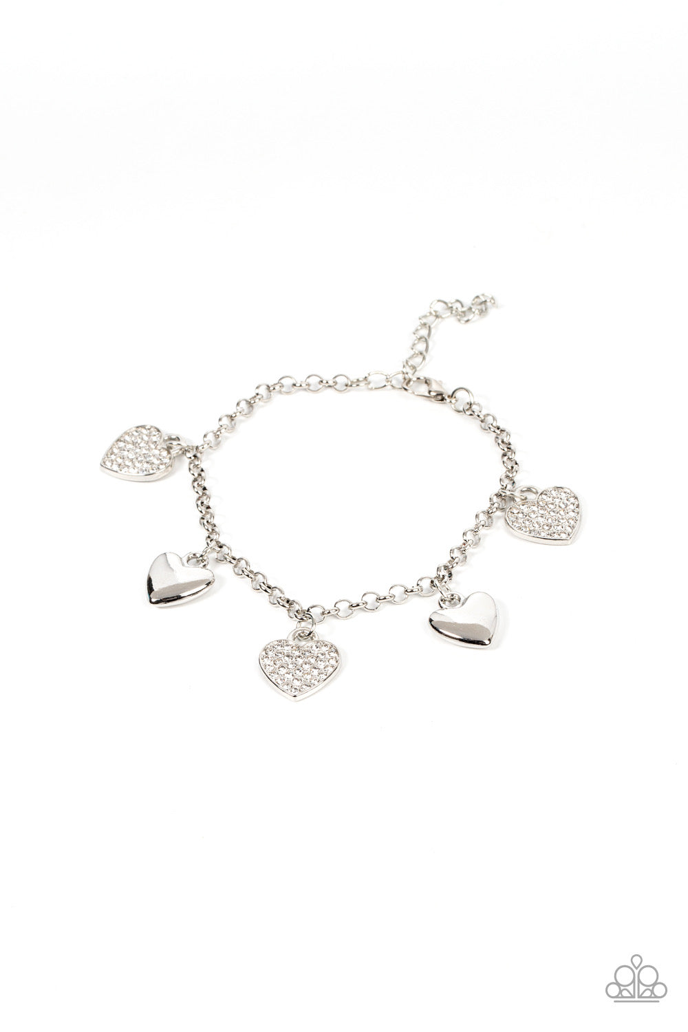 Shiny silver heart charms delicately alternate with white rhinestone encrusted heart frames along a silver chain around the wrist, resulting in a flirtatious fringe. Features an adjustable clasp closure.