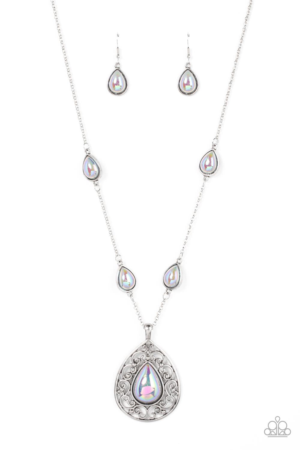 Brushed in an iridescent finish, a silvery teardrop bead is pressed into the center of an oversized silver teardrop frame that is bursting with vine-like filigree. Infused with matching teardrop beaded frames, the ethereal pendant glides along the beaded silver chain for a magical finish. Features an adjustable clasp closure.