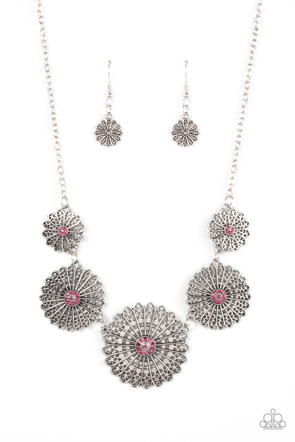 Infused with a whimsical mandala-like motif, tactile silver petals bloom from pink rhinestone dotted centers below the collar. The mismatched silver flowers gradually increase in size, exaggerating the eye-catching details. Features an adjustable clasp closure.