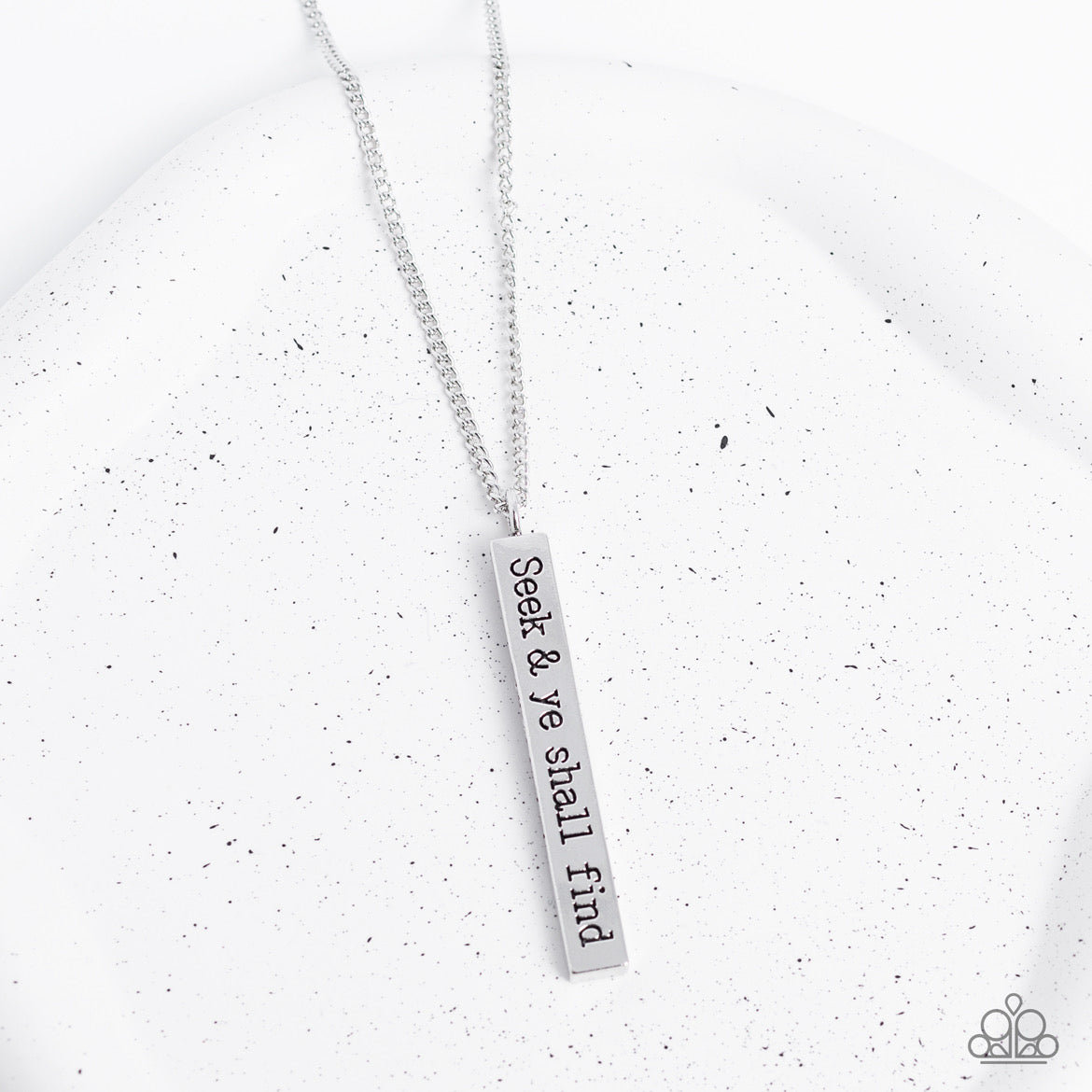 A flattened rectangular pendant is stamped in the biblical phrase, "Seek & ye shall find. Matt7:7," creating an inspirational sight at the bottom of an extended silver chain. Features an adjustable clasp closure.