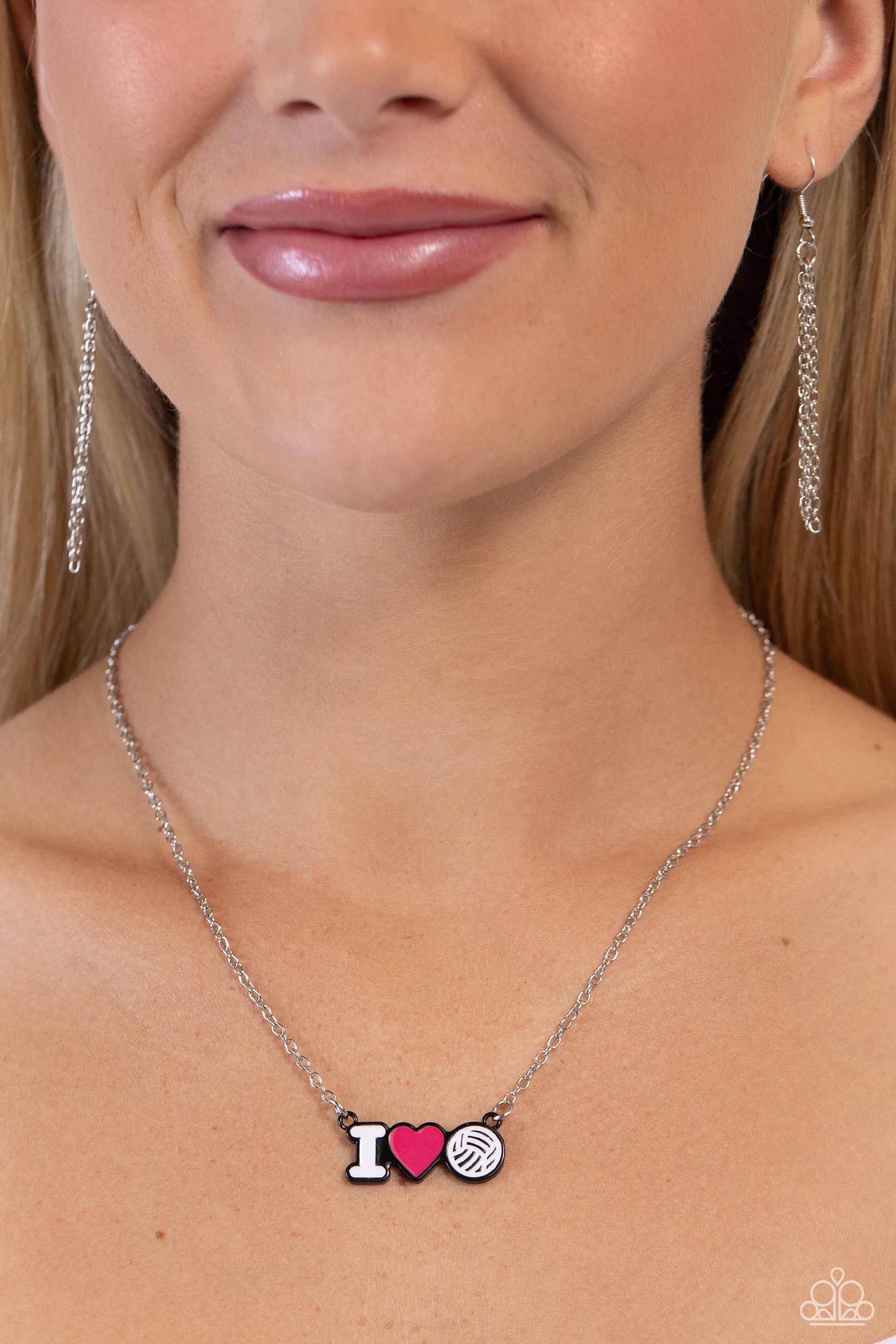 Cascading from a dainty silver chain, a white-painted "I," a pink heart, and a white volleyball charm lay beside one another in black-painted frames for a sports-inspired display. Features an adjustable clasp closure.