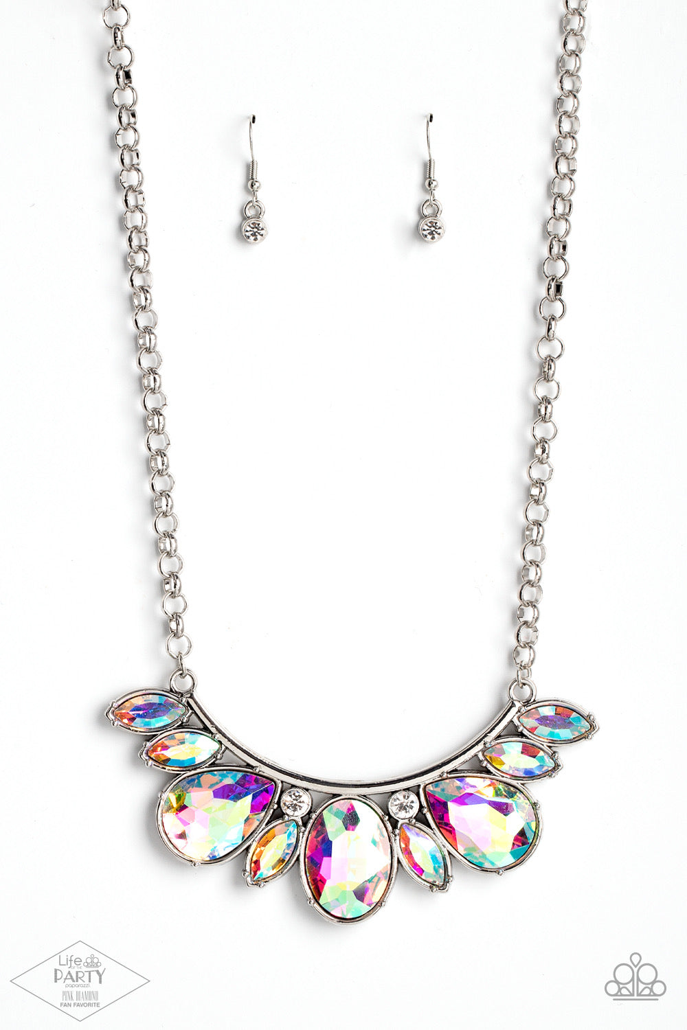 Infused with a pair of glassy white rhinestones, an oversized collection of marquise and teardrop iridescent rhinestones drips from the bottom of a bowing silver bar, coalescing into a sassy statement piece below the collar. Features an adjustable clasp closure.