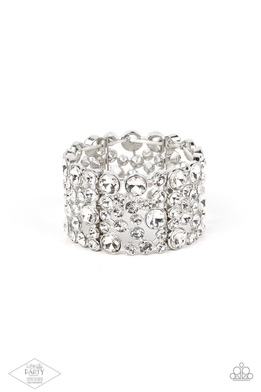 Varying in size, a collection of glassy white rhinestones coalesce into blinding silver frames. The glittery frames are threaded along stretchy bands, creating a show-stopping sparkle around the wrist.