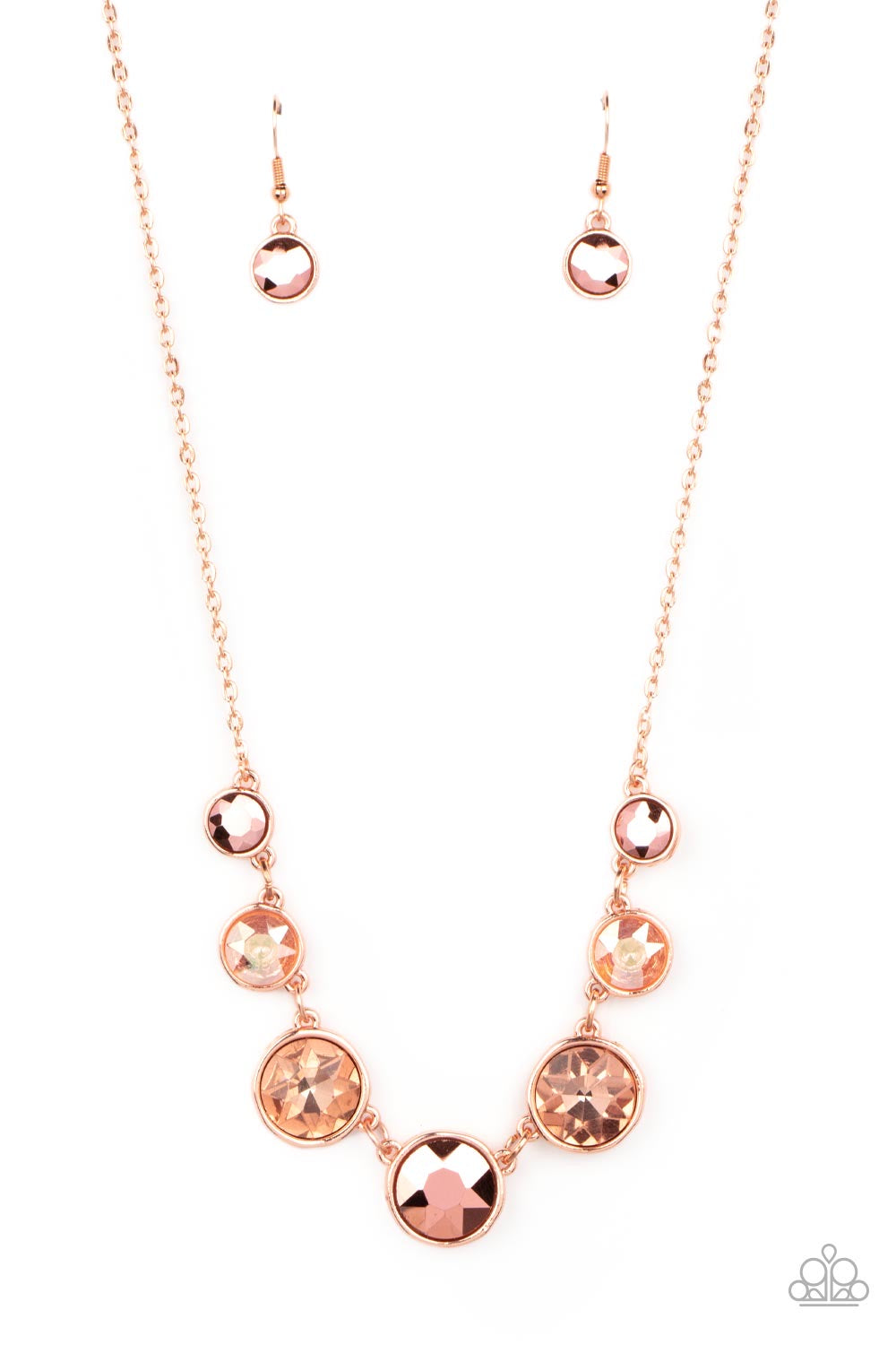 Encased in shiny copper frames, a glitzy collection of coppery aurum, coppery peach, and crackly peach gems gradually increase in size as they link below the collar for a flawless finish. Features an adjustable clasp closure.